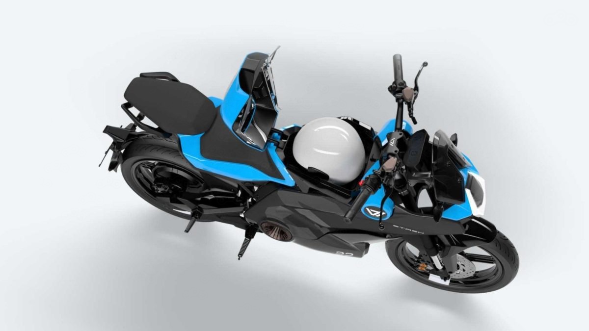 Внизу обтекателя расположены наклейки с цифрами “22”. У новинки двухцветная окраска, насколько видно по фото, запланированы как минимум два варианта окраски. У электроцикла широкий руль и багажник на том месте, где у мотоциклов с ДВС расположен бензобак, туда помещается закрытый шлем.