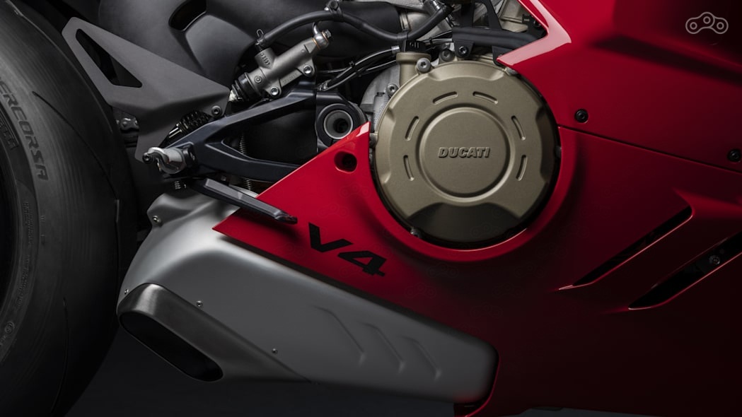 Стандартный Panigale V4 будет комплектоваться вилкой Showa Big Piston Fork и амортизатором Sachs, V4 S – компонентами Ohlins, на обоих мотоциклах ось маятника была перенесена на 5 миллиметров вверх. У V4 – литые десятиспицевые алюминиевые колёсные диски, у V4 S – девятиспицевые кованые.
