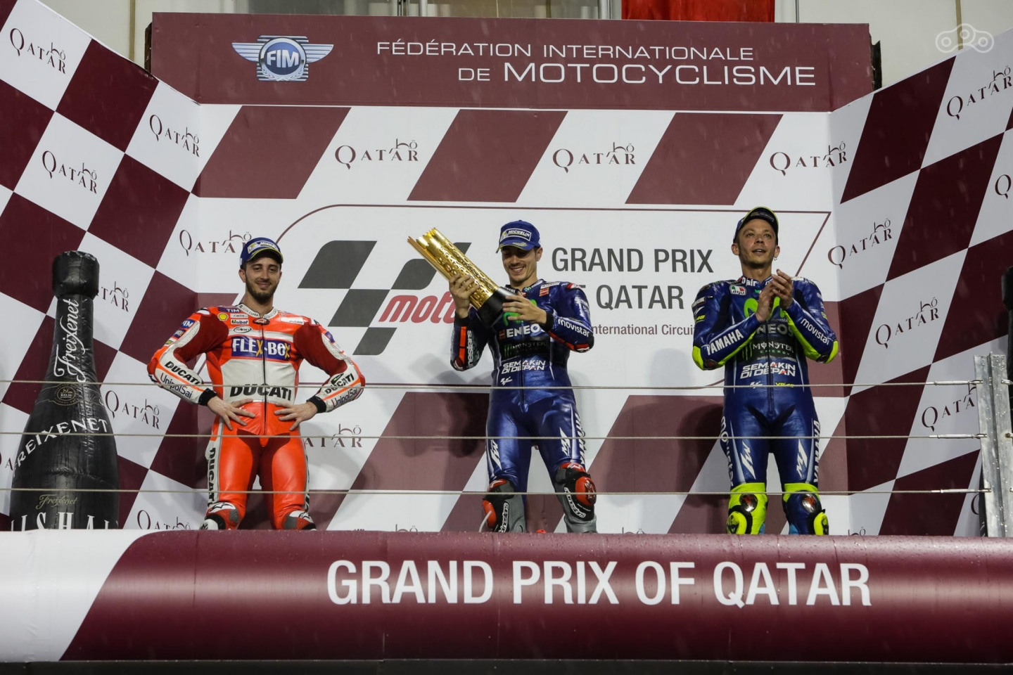 Андреа Довизиозо, Маверик Виньялес и Валентино Росси на подиуме Гран-При Катара