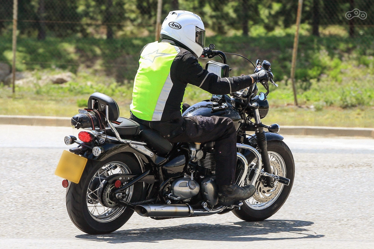 Мотоцикл, попавший в объектив камеры корреспондента, конструктивно похож на модель Triumph Bonneville Bobber, однако имеет ряд существенных отличий. В первую очередь, новинка отличается массивным подрамником с двухместным сидением и спинкой для пассажира. На первый взгляд может показаться, что у байка «сухая» рама, однако это не так. Как и у «Боббера» здесь использована рама типа «софтейл», в которой задний маятник закреплен на оси, а под сидением располагается невидимый глазу моноамортизатор.