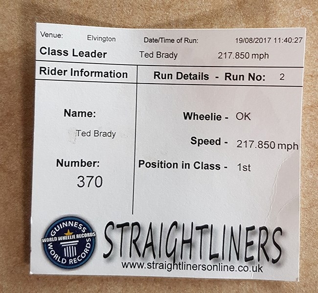 Рекорд был установлен на взлётной полосе военного аэродрома в Северном Йоркшире в рамках ежегодного мирового чемпионата по скоростной езде на заднем колесе мотоцикла. В состязании приняли участие тридцать лучших спортсменов из США, Великобритании, Франции и Нидерландов, однако самым быстрым оказался ирландский гонщик.