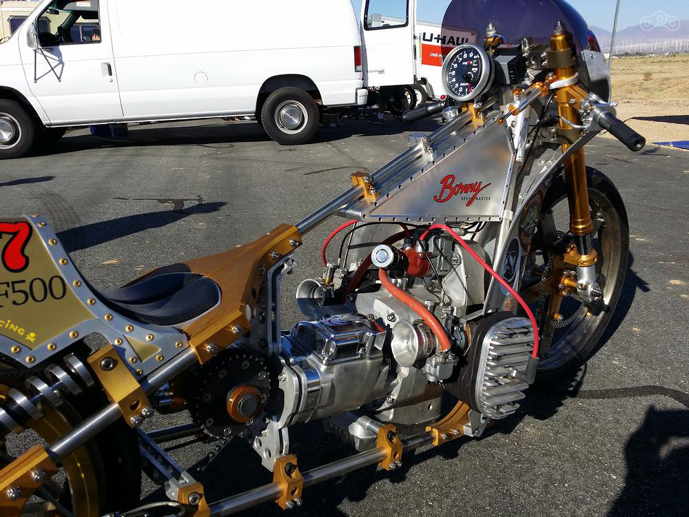 Проект Bonny создан специально для «Бонневилля». В качестве двигателя используется дора-ботанный, форсированный и переведенный на метанол нижнеклапанный оппозитный двига-тель от «старичка» М-72. Двигатель включен в конструкцию титановой рамы для повышения жесткости. Постройка мотоцикла заняла четыре месяца.