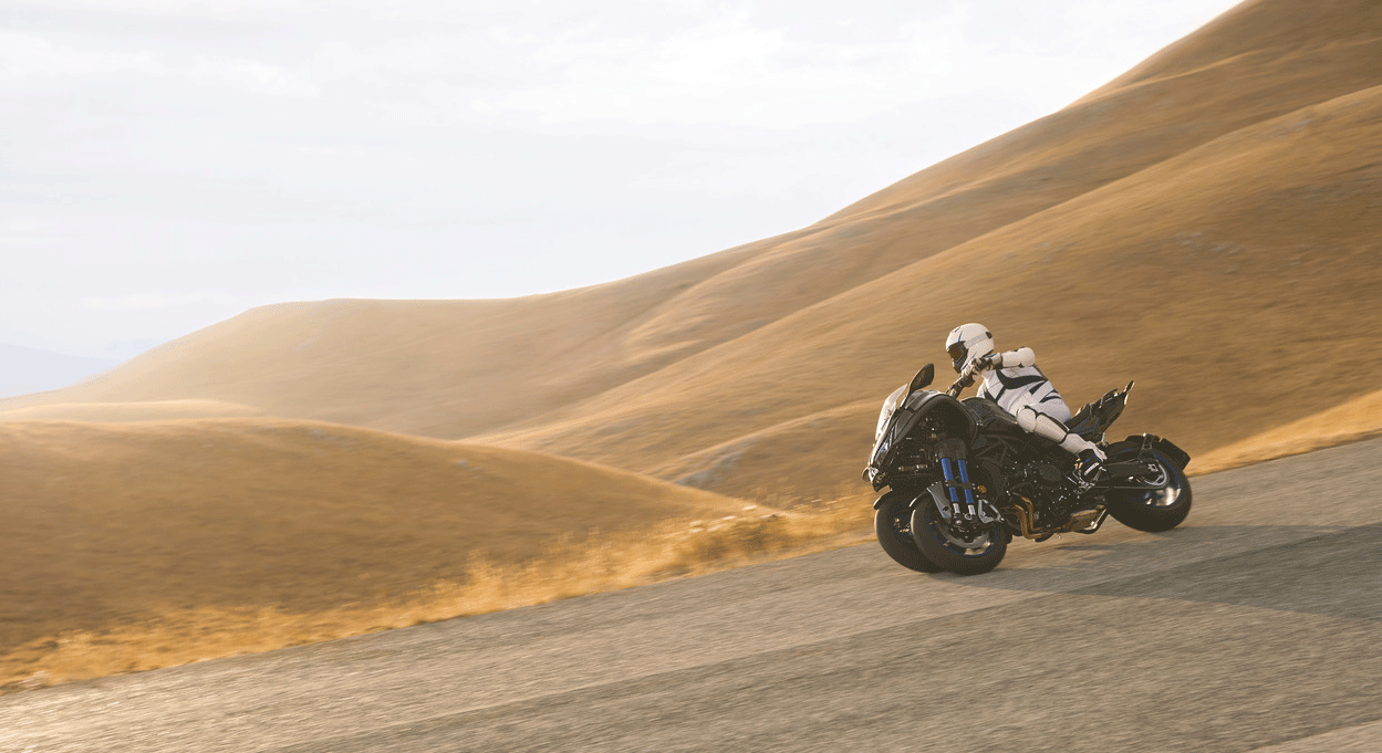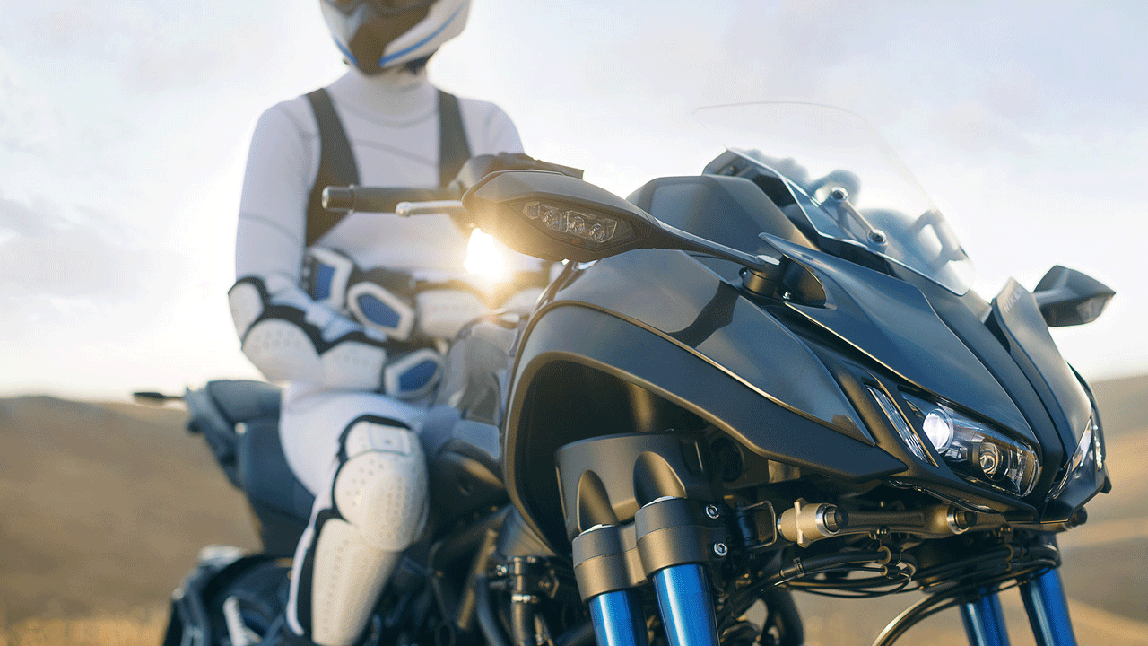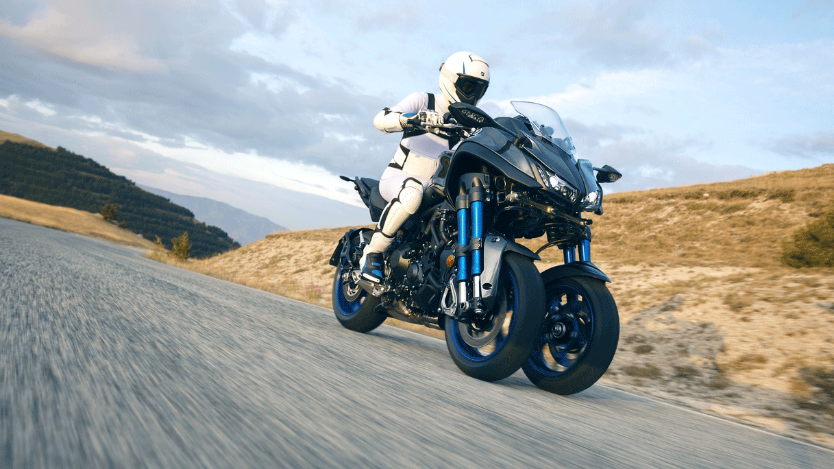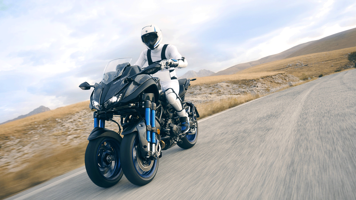 Как и ожидалось, трицикл приводит в движение трёхцилиндровая силовая установка, позаимствованная у Yamaha MT-09. Два управляемых пятнадцатидюймовых колеса, консольно закреплённых на ступице, подрессорены парой сдвоенных телескопических стоек, которые в свою очередь через сложную систему рычагов соединены с рулевым управлением машины. В ролике, трицикл под управлением тест-пилота уверенно поглощает закрученные виражи горного серпантина, отклоняясь от вертикальной оси на приличный угол без намёка на какой-либо дисбаланс. Вероятно, в том заслуга запатентованной технологии LMW (Learning Multi-Wheel), опробованной ранее на скутере Tricity.