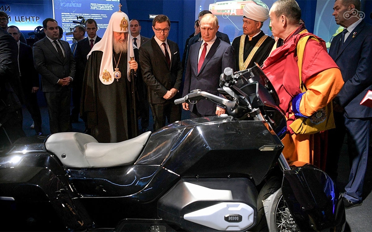 Президент осмотрел мотоцикл в сопровождении Патриарха Московского и Всея Руси Кирилла, а также других духовных сановников, выслушал рассказ куратора выставки, генерального продюсера кинокомпании «Мастерская» Саида Медведева, об экспозиции, а затем отправился осматривать павильоны «Промышленность», «Информационные технологии», «Космос» и «Здоровье».
