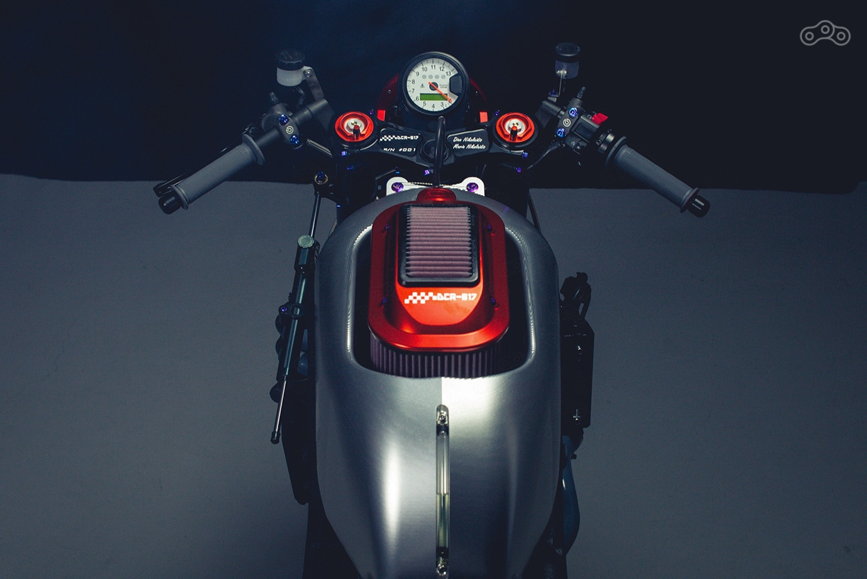 Издалека мотоцикл выглядит обыденно, однако, приблизившись к нему вплотную, хочется разглядывать и щупать каждую деталь, получая настоящее эстетическое удовольствие. Большинство его деталей, включая хвост и топливный бак были изготовлены из больших цельных кусков алюминия на 3D-станке с ЧПУ. Часть деталей было анодировано, а другую просто «укрыли» лаком, чтобы оградить от агрессивного воздействия окружающей среды.