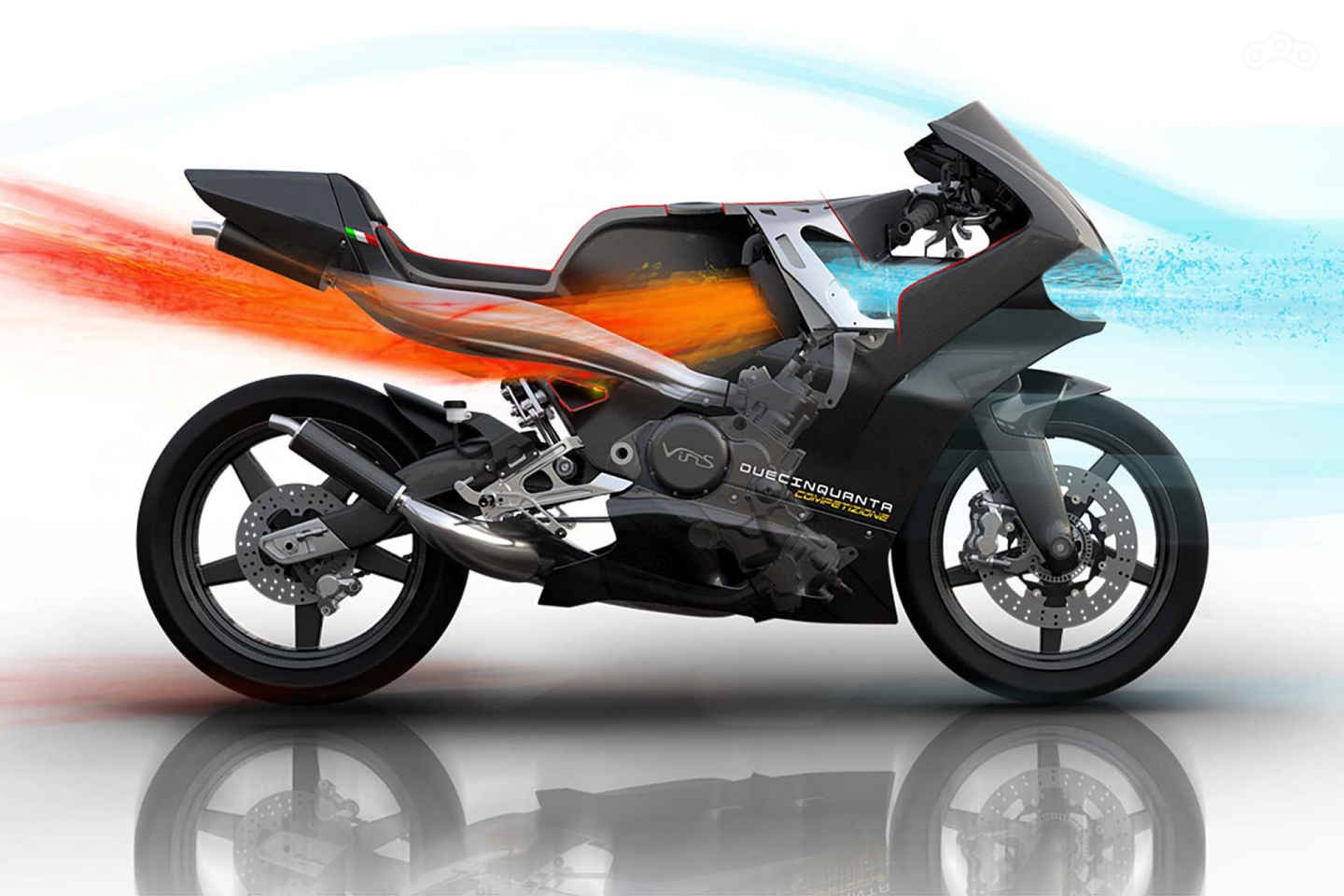 Среди них – итальянская Vins Motors со своим новым проектом Duecinquanta («двести пятьдесят» в переводе с итальянского). Это эволюционная версия концепта, показанного осенью 2015 года в Милане. Мотоцикл получил двухтактный V-твин с рабочим объёмом 249 см3 (прежняя версия была 100-кубовой) и практически такое же углеволоконное шасси с оригинальной подвеской, опережающее по показателям гран-прийные болиды прошлых лет.