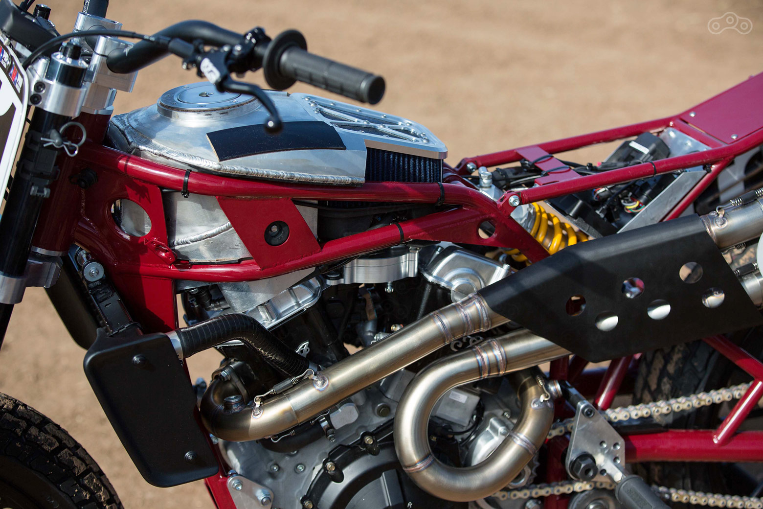 Сверхлёгкая стальная рама, прямоточная выхлопная система S&S, а также легковесные карбо-новые элементы призваны снизить общую массу мотоцикла, равно как отсутствие передней тормозной системы – передний тормоз в гонках флэт-трек не используется. На заднем тормозе установлена система Brembo.