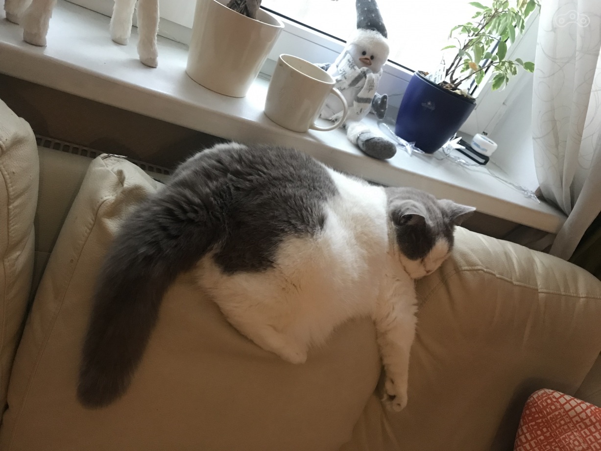 Иногда он спит вот так. Чудной кот, с коротеньким хвостиком.