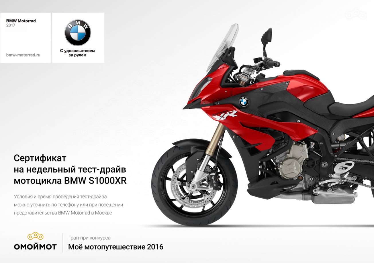 Суперфиналист розыгрыша, который будет проведён в понедельник, 20 февраля ровно в 8 вечера, получит сертификат на недельный тест-драйв потрясающего спортивно-туристического мотоцикла BMW S1000XR 2017-го модельного года!