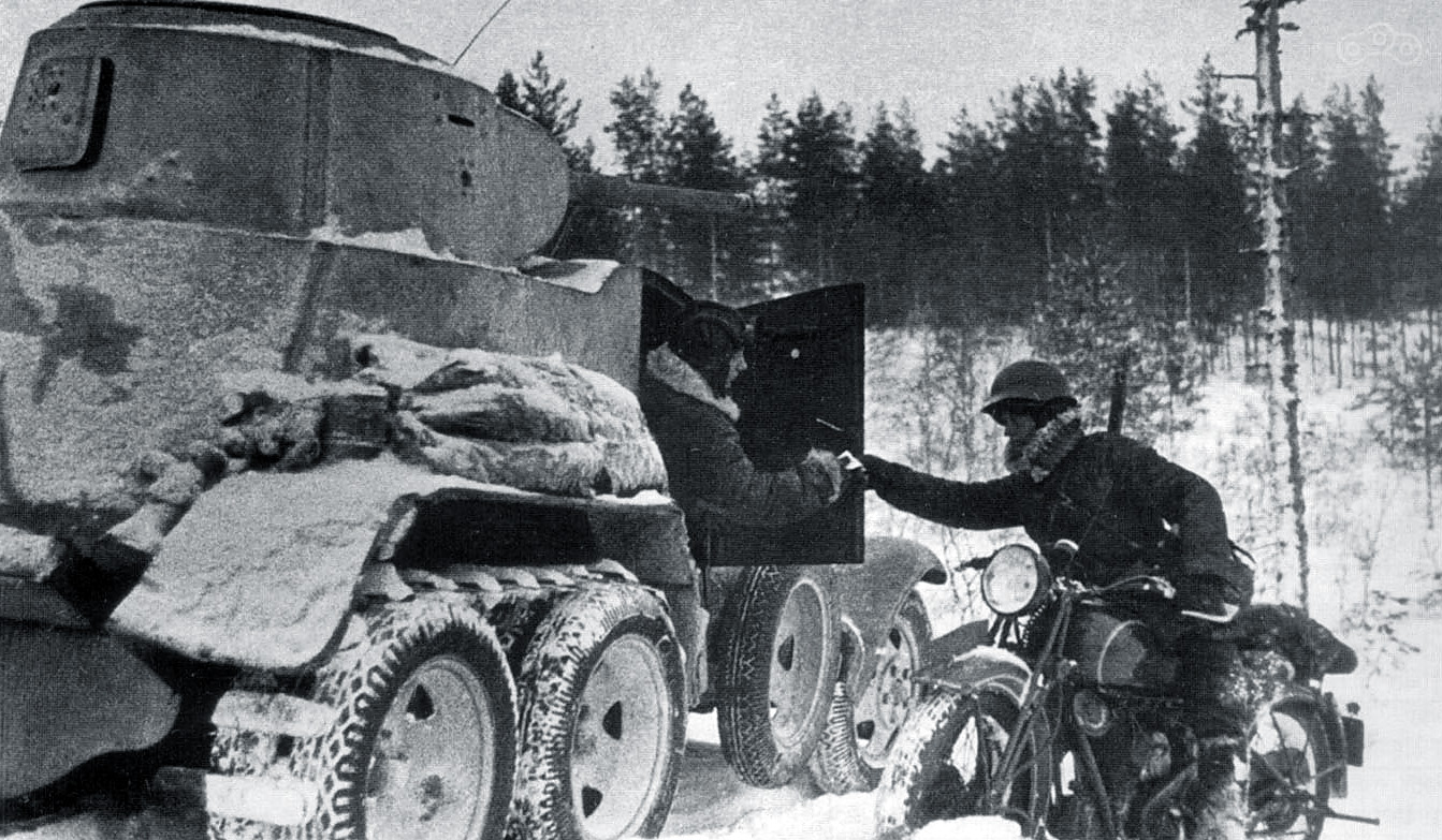 6. Мотоцикл ТИЗ АМ-600 и бронеавтомобиль БА-10 – мотоциклист доставляет пакет в период Финской войны.