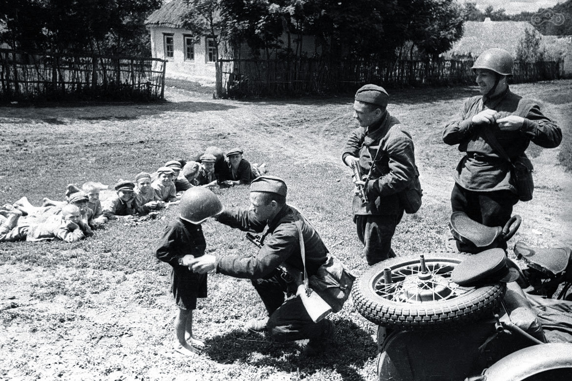9. Советские дети и солдаты мотоциклетных войск Красной Армии.