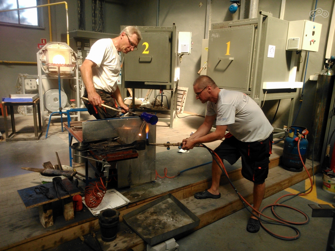 Это реально действующая фабрика с возможностью доступа на производство. Трое мастеров легко и просто изготавливают произведения искусства из стекла. Не смотря на языковой барьер мы очень хорошо пообщались, я успел получить производственную травму, зато мне дали выдуть из стекольной массы шар. Шар получился хреновым: в процессе дутья стекло охлаждается и силу наддува нужно увеличивать.