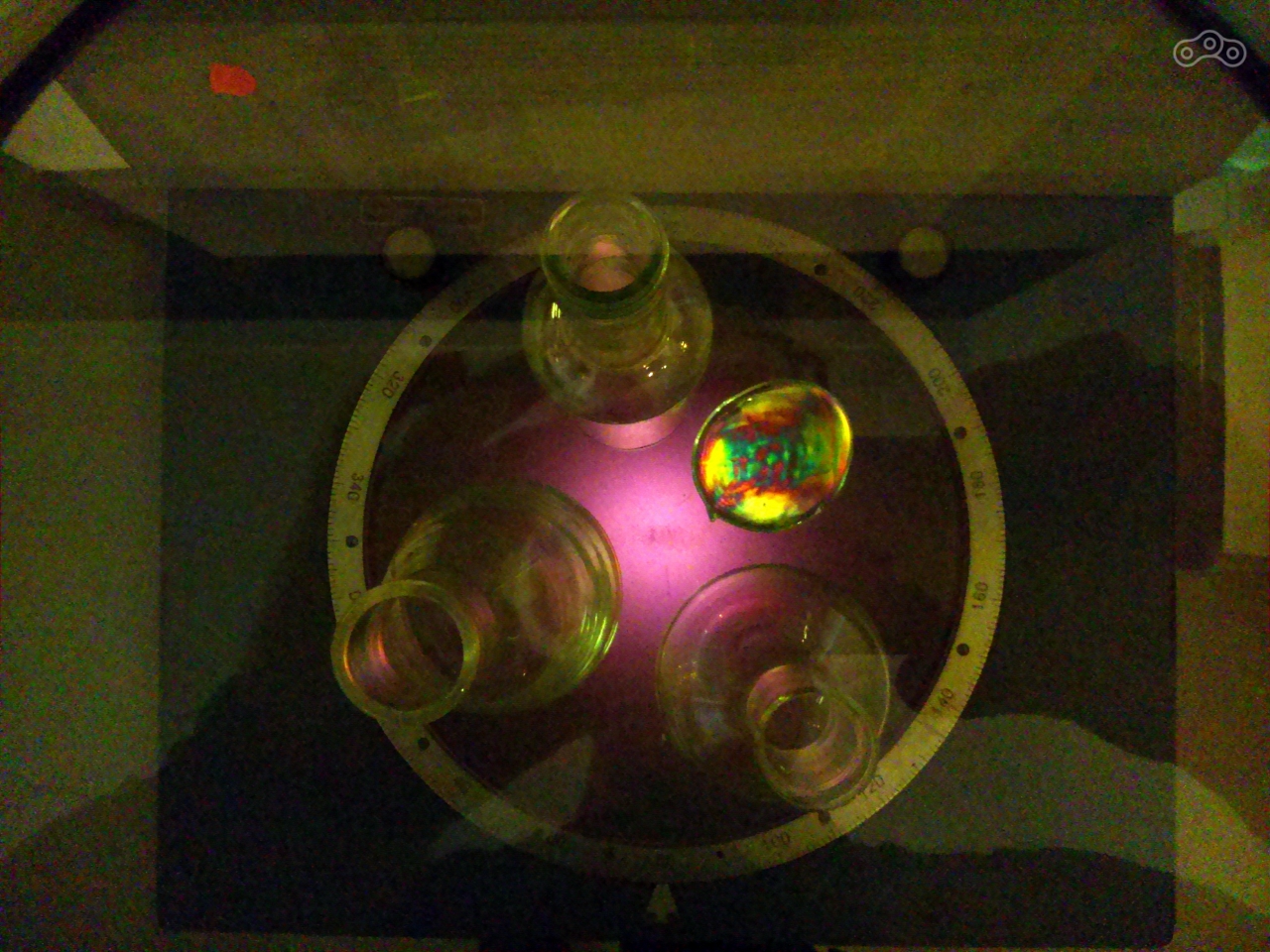 Установлен лабораторный рефрактоскоп. Радужная окраска говорит о наличии внутренних напряжений в изделии. Такое стекло может лопнуть при перепаде температур. Ещё я узнал что отражающий материал в дорожной разметке это стеклянные микросферы.