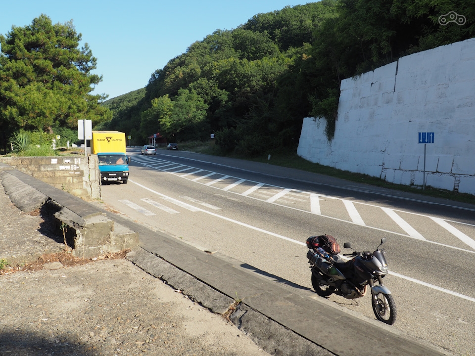 Заехал на площадку после Туапсе . Тут я тоже тормозил в прошлом году на скутере . Стоянку для грузовиков убрали перегородив площадку бетонными блоками . Но положили новый асфальт. Уже не плохо . Вид совсем не изменился .