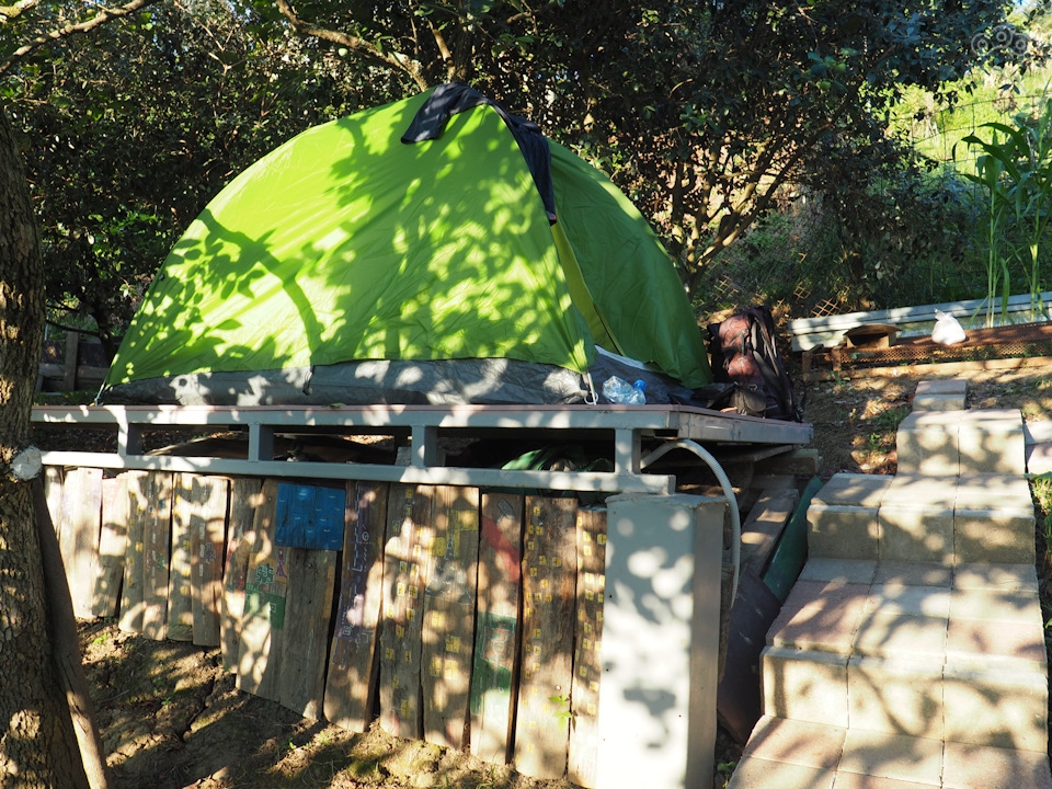 Закатываю мотоцикл во дворик и иду за Глебом за домик . А там на склоне горы под деревьями фейхоа и хурмы стоят помосты под палатки . С освещением, розетками . Внизу у дома веранда с мангалом и кухней . Ниже душ с горячей водой и туалет . Плюсом тёплый домашний приём .