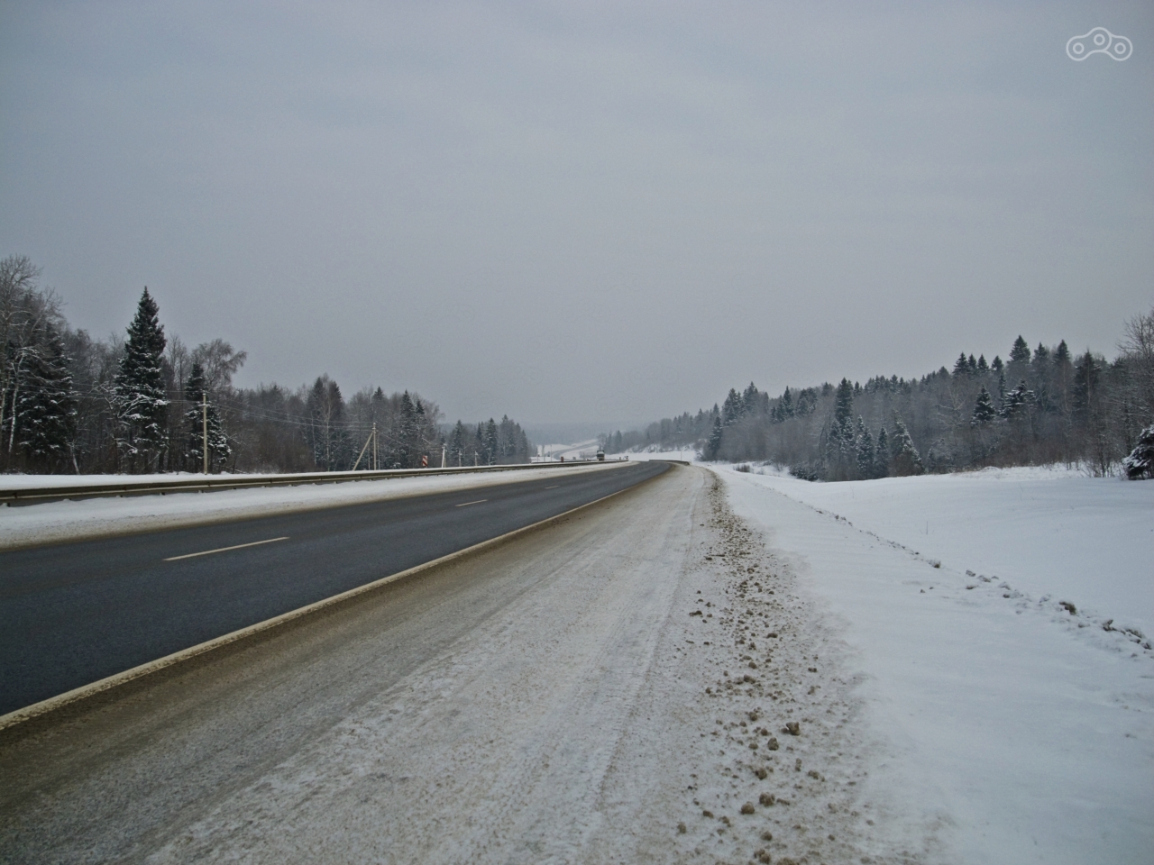 К тому моменту, как я выехал за пределы А108, снегопад закончился, и влажность упала, стало теплее по ощущениям. Однако ноги всё равно мёрзли, приходилось часто останавливаться, чтобы согреться. Всё же надо что-то делать с ногами. Либо менять обувь на что-то более подходящее. У моих мотобот Forma Adventure на морозе очень быстро промерзает подошва, поэтому можно сколько угодно тёплых носок надевать, но ногам всё равно холодно будет. Либо мутить какую-то быстросъёмную защиту от ветра для ног на мотоцикл. С комплектом зимних носок я определился. Это Lorpen Heavy Tracker. Плюс летом я всё же придушил жабу и купил тонкие мембранные носки. Надеваю их поверх тёплых, и ногам уже не страшна жижа, летящая на мотоботы. У мотобот тоже когда-то была мембрана, но она уже давно сдохла от реагентов. Также я вложил в ботинки фольгированные стельки, но всё равно такого комплекта больше чем на 45-60 минут беспрерывной езды не хватает из-за промерзания подошвы мотобот. Приходится заходить в помещение и ждать пока обувь отогреется. Да и снегоходная экипировка, куртка и штаны, у меня недорогие, утеплитель у них синтетический и уже изрядно «похудел», поэтому греет заметно хуже. В общем всё как обычно – 45 минут едешь, 15 минут греешься. Если ехать дольше, то потом больше времени на согрев уйдёт, так что всё равно средняя скорость получается около 40 км/ч. Не готов я в общем к «полярным экспедициям». ))))