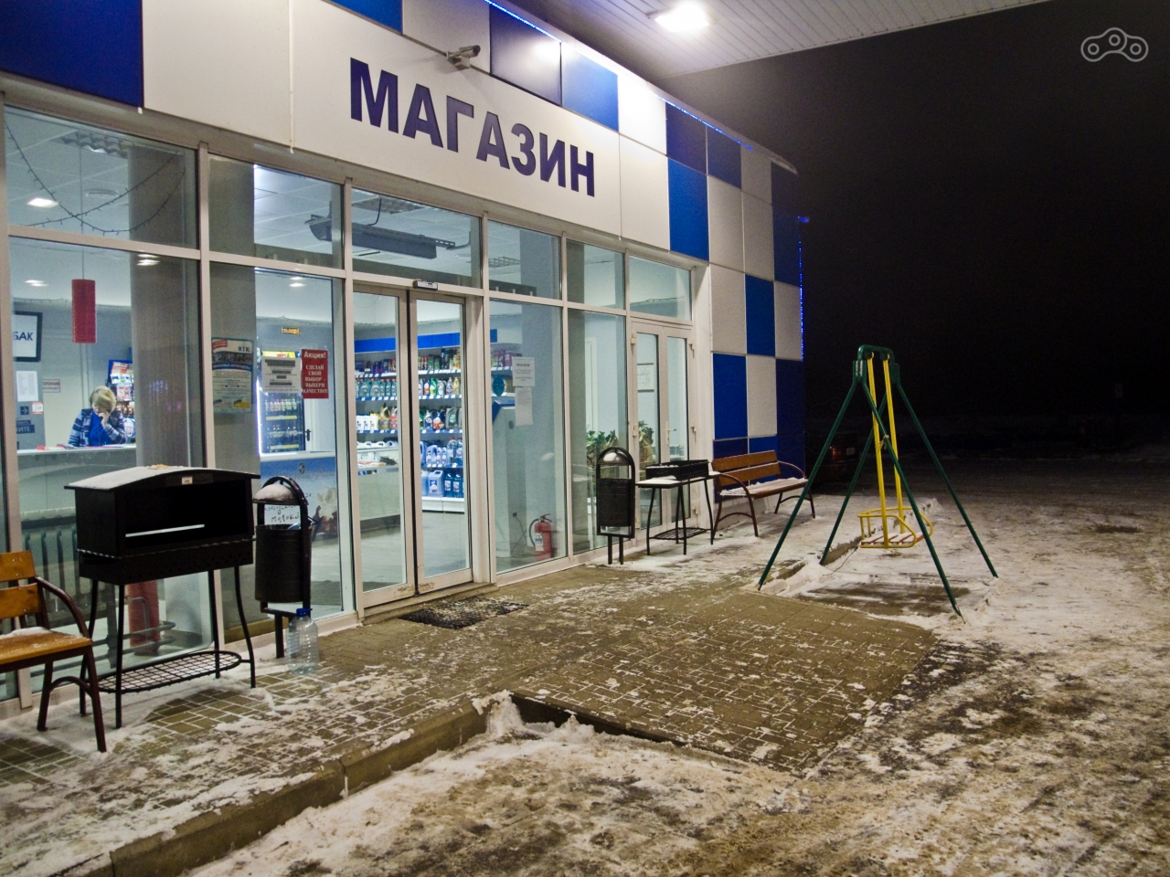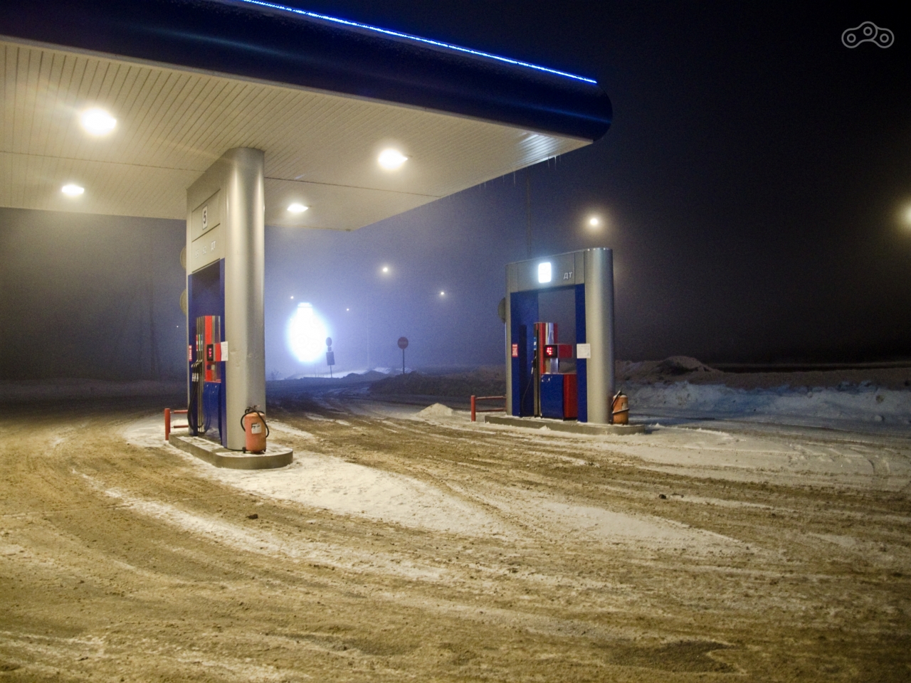 Когда я выехал на трассу Кострома-Ярославль, я был удивлён тем, что она почти вся была покрыта густым туманом. Я и не знал, что в мороз бывает такой густой туман, думал он просто оседает в виде инея. Было абсолютно ничего не видно уже в 50 метрах впереди, приходилось тащиться 20-30 км/ч с открытым визором, который обмерзал изнутри при попытке его закрыть. В тумане меня обогнала легковушка с прицепом и двумя мотоциклами в нём. Через какое-то время я понял, что у меня и ресницы уже инеем покрылись – веки изрядно потяжелели. Я остановился на привал на очередной АЗС. Прямо у входа я неожиданно обнаружил лавочки, два мангала и детские качели. Меня несколько удивило такое соседство. Однако по размышлении пришла в голову мысль, что вероятно эти предметы продаются, так же как я видел на какой-то АЗС продавали звероловки. Народ выживает как может...