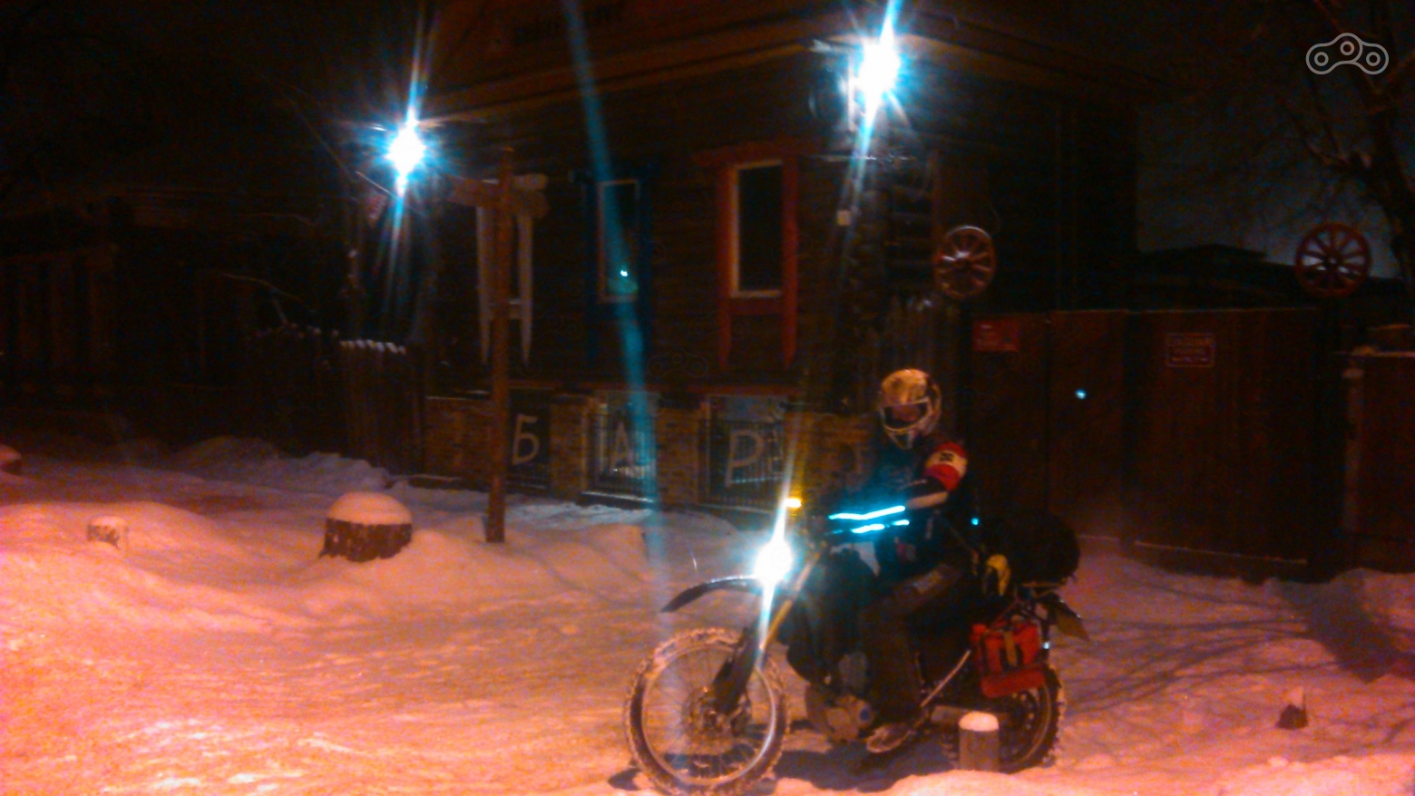 Пока мы общались с охраной, к воротам подрулил мерседес из местных и высадил человека в эндурной экипировке. Парень был в жутком состоянии, его качало от усталости. Это был один из участников гонки. Оказалось, что он застрял в одном из оврагов на трассе, и пока вытаскивал мотоцикл из ручья, тот успел обмёрзнуть на столько, что даже ручка газа не вращалась (а морозец был ниже -10°C). При этом его супруга в лагере подходила уже к организаторам, пытаясь их отправить его искать, но они от неё отмахнулись, сказав «У нас все приехали» (это дословно то, что я видел и слышал). Я смотрел на всё это с недоумением, а пока охрана запрашивала что им делать с новоприбывшим, парень пытался превратить лёд в своей пластиковой бутылке в воду, чтобы хоть немного попить. У меня в кофре валялась бутылка Боржоми. Минералка конечно тоже частично замёрзла, но пить можно было. Я дал ему попить, а потом его таки впустили на территорию. Никому из охраны даже в голову не пришло дать ему кипятка или чаю, который, я уверен, был у них в вагончике. Эвакуацию мотоцикла тоже отложили на утро (если к утру там ещё будет что эвакуировать).