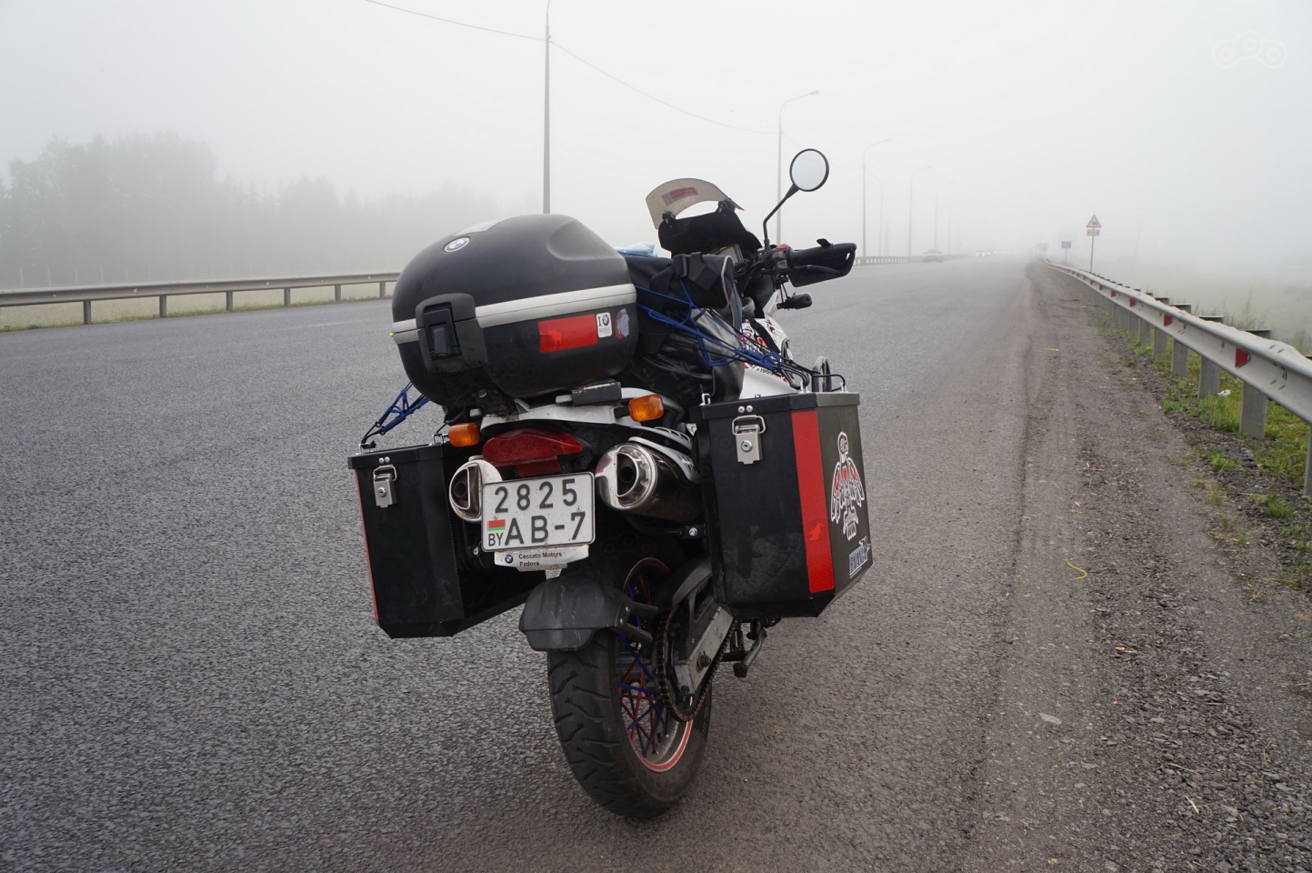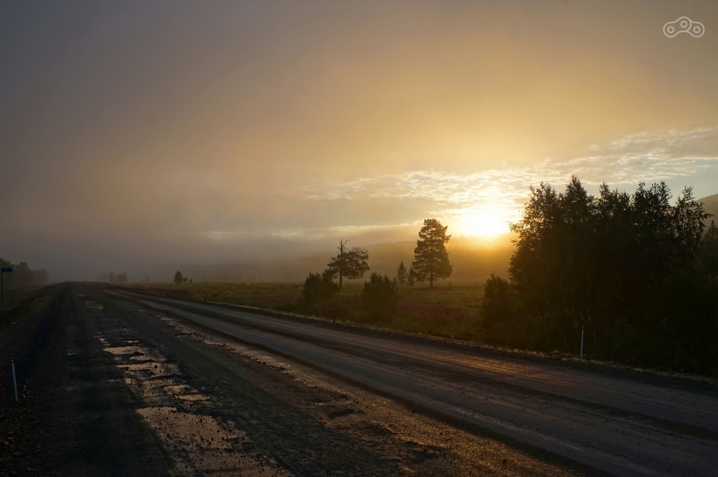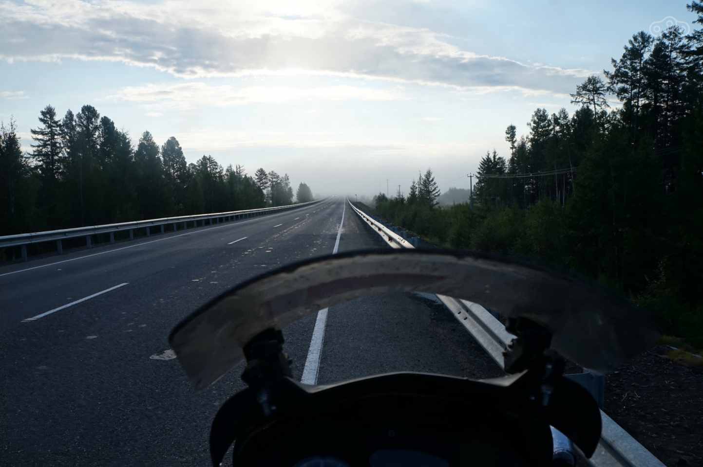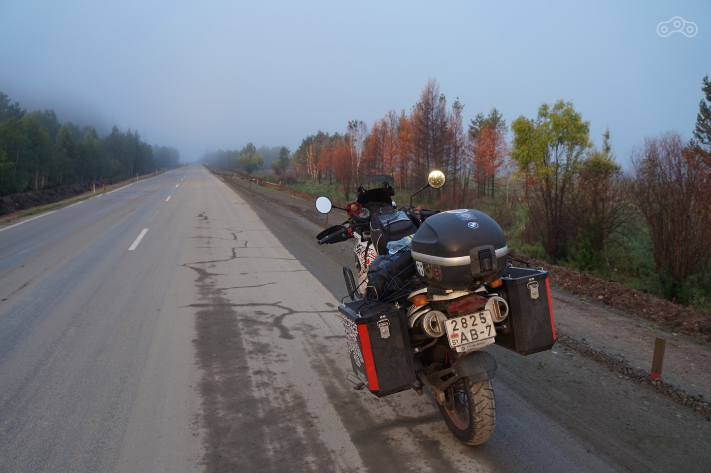 Выехала очень рано – надо наверстать вчерашние 300 км. Везде стелится плотный туман, дорога становится хуже, на ухабах из сумки на баке вылетает телефон. Быстро останавливаюсь, бегу обратно искать. Немного поцарапан, отколот кусочек, но работает. Еду вперед.