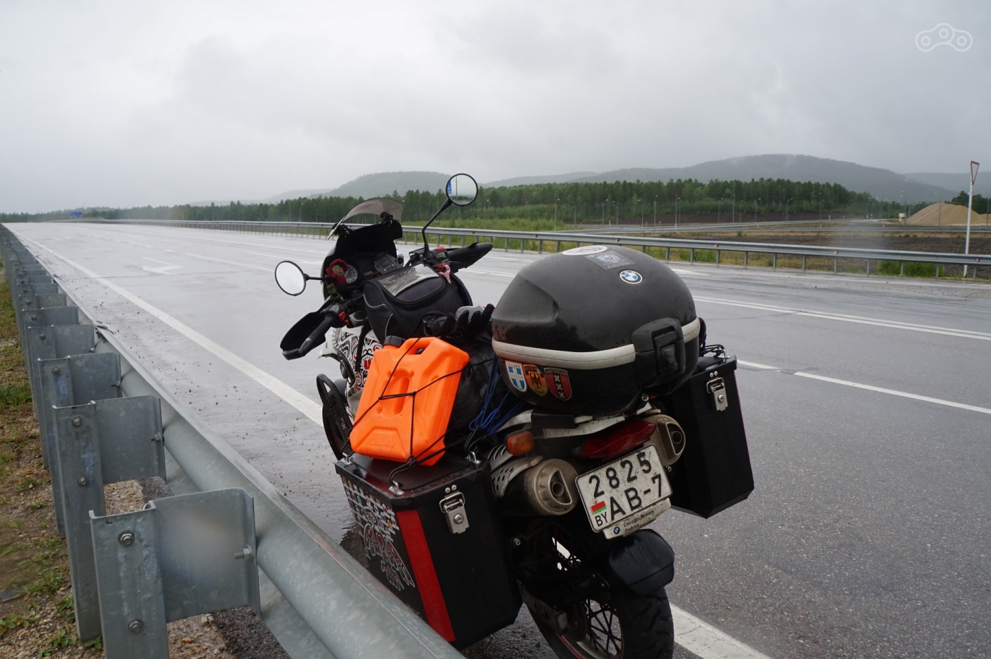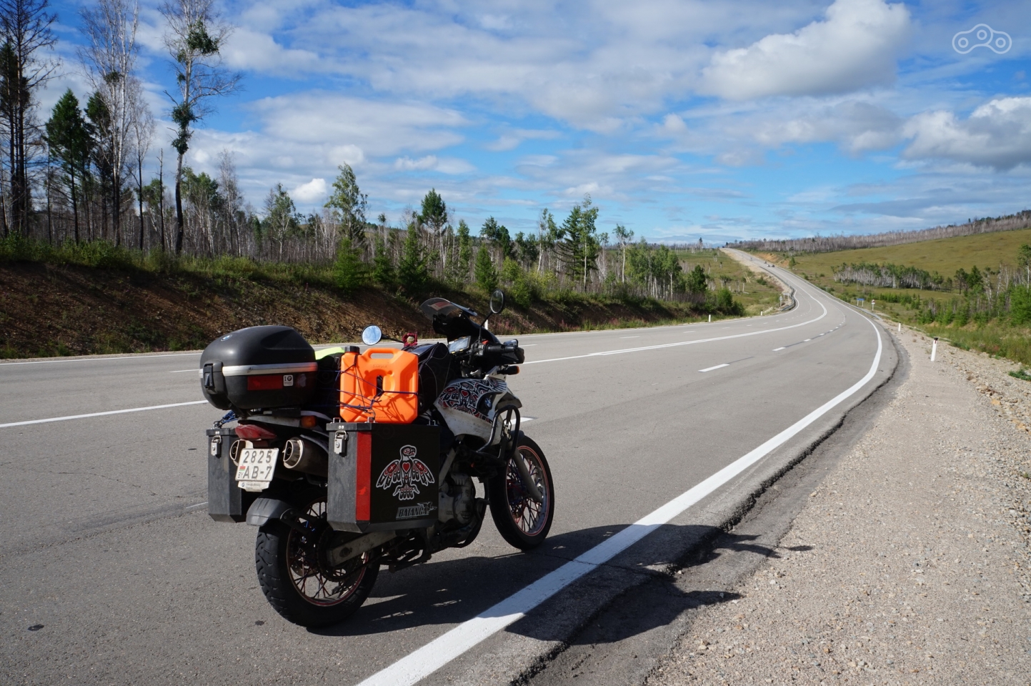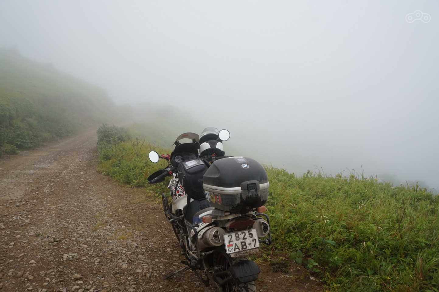Выехала очень рано – надо наверстать вчерашние 300 км. Везде стелится плотный туман, дорога становится хуже, на ухабах из сумки на баке вылетает телефон. Быстро останавливаюсь, бегу обратно искать. Немного поцарапан, отколот кусочек, но работает. Еду вперед.