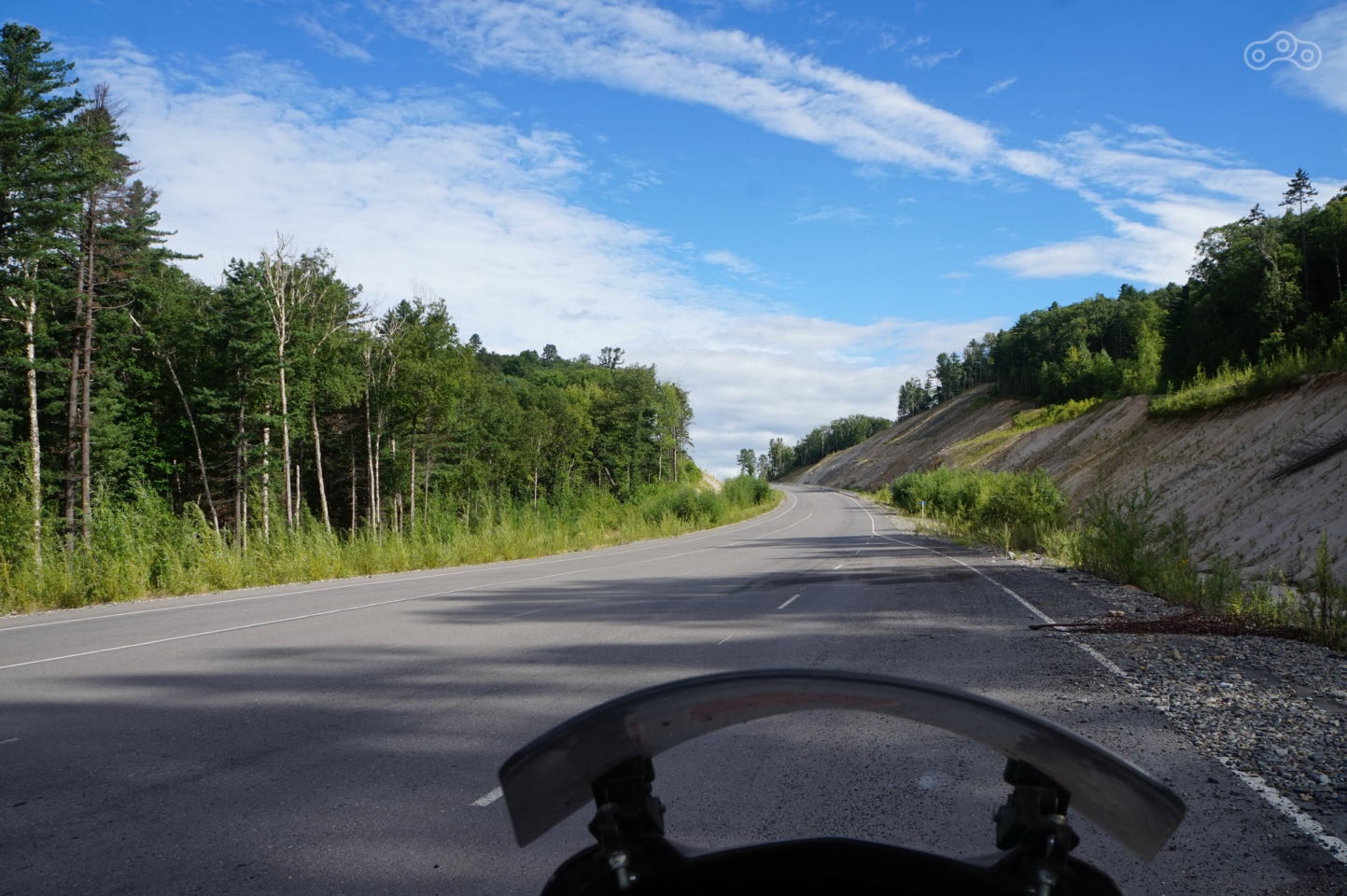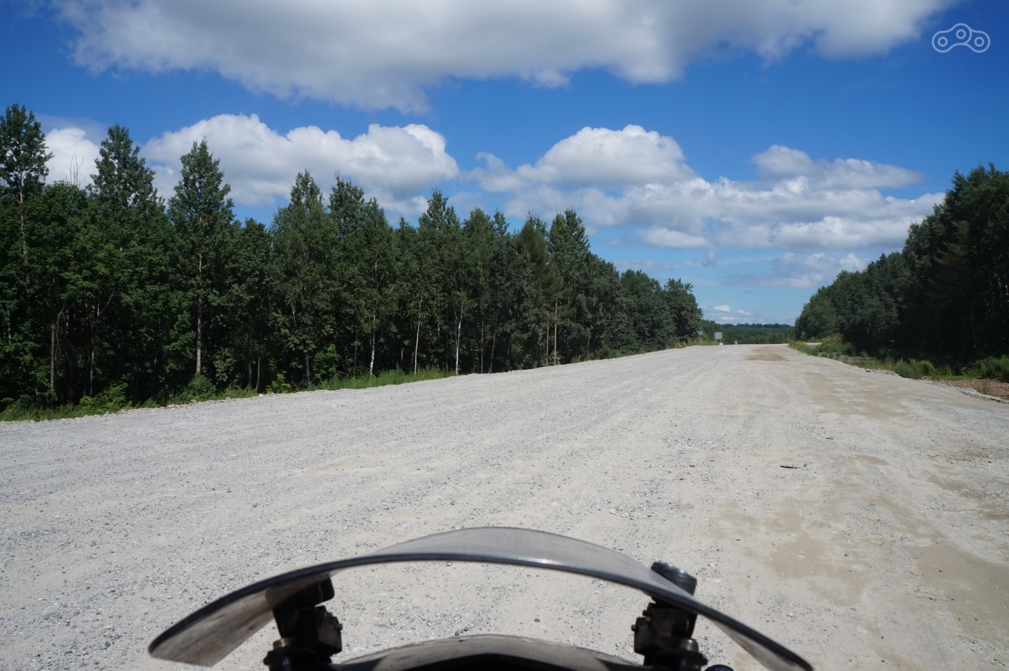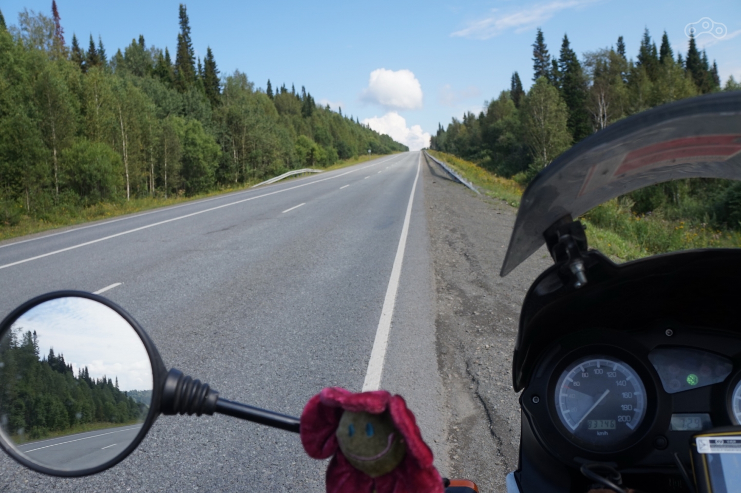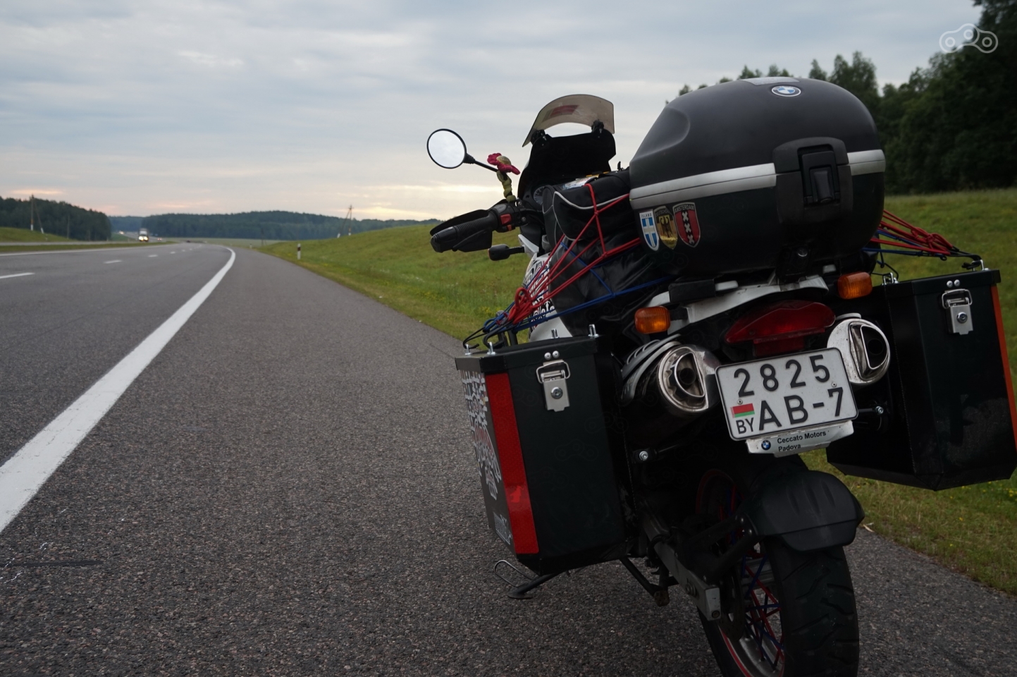 Выехала очень рано – надо наверстать вчерашние 300 км. Везде стелится плотный туман, дорога становится хуже, на ухабах из сумки на баке вылетает телефон. Быстро останавливаюсь, бегу обратно искать. Немного поцарапан, отколот кусочек, но работает. Еду вперед.