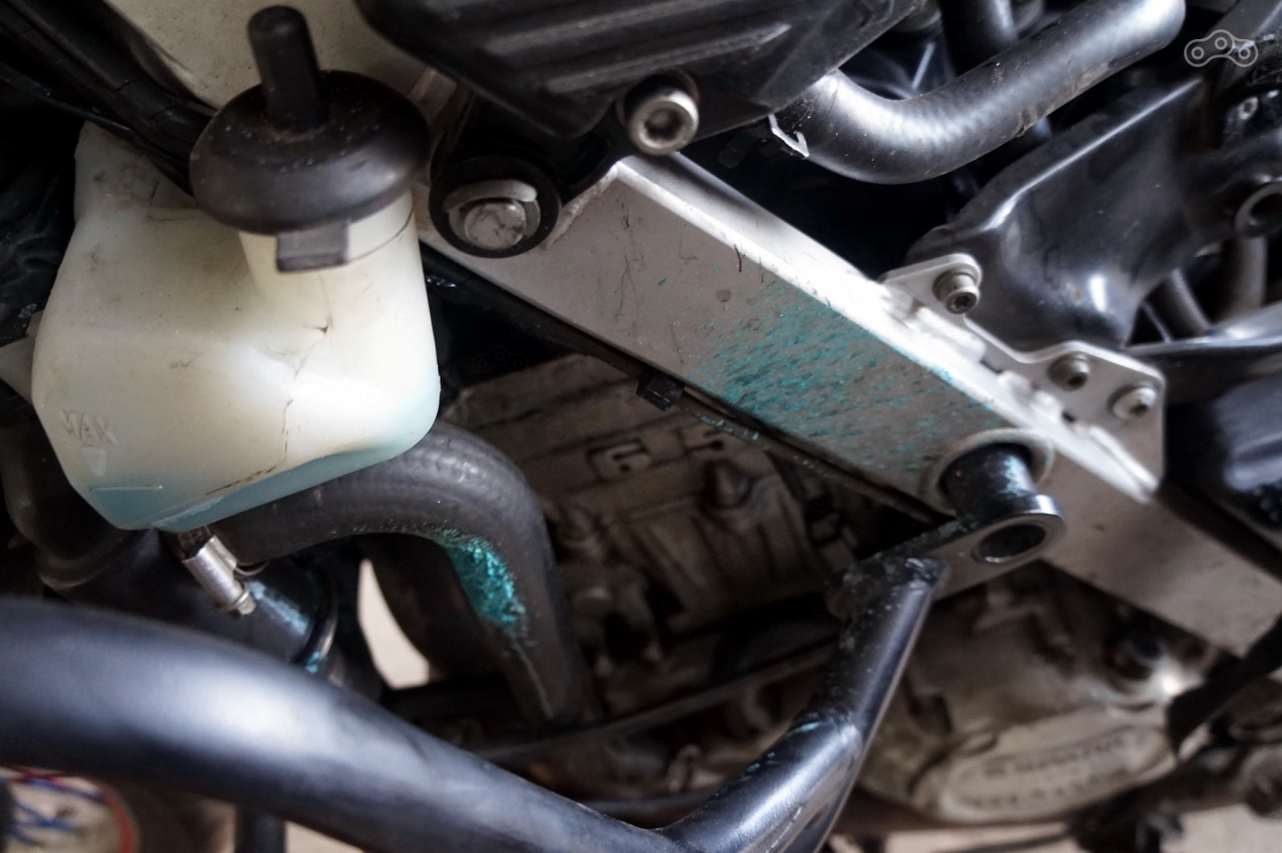 Утренний осмотр мотоцикла показал, что шланг с антифризом не смог пережить вчерашнюю жару, видимо, раздулся и перетерся в районе хомута, обильно полив синей жидкостью левый бок Генри.