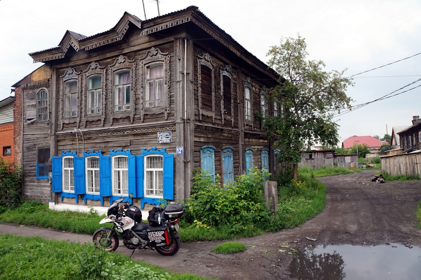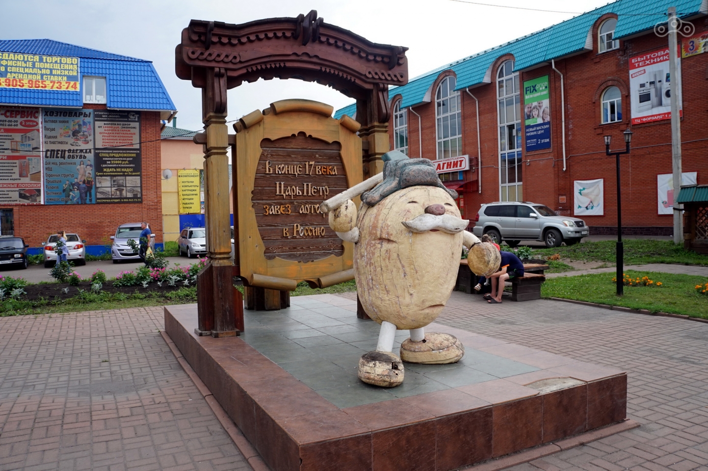 Двигаемся дальше. Впереди Красноярск. Ландшафт уже совсем сибирский, вокруг бескрайняя тайга. Красотища! В Мариинске нахожу памятник картошке и несколько старинных русских домов.