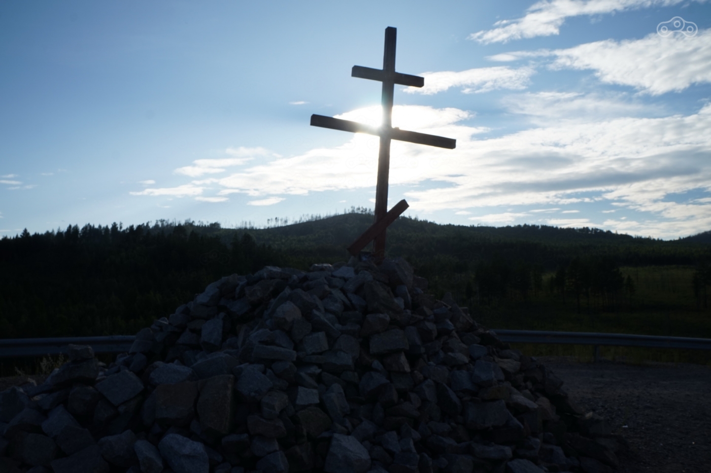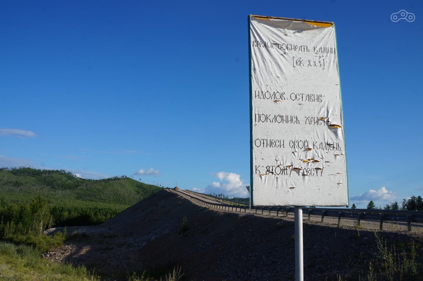 Пейзажи великолепные, хочется кричать от восторга и всё время фотографировать. На горизонте вижу крест на горочке и какой-то щит. Остановилась. «Время собирать камни. Идолов оставив, поклонись Христу. Отнеси свой камень к этому кресту». Я не так давно пришла к религии, меня не крестили в детстве и я не хожу в церковь, верю, что храм внутри человека, а не снаружи. Как пел Егор Летов «нет атеистов в окопах под огнем», так и находясь долгое время в Дороге невозможно ни во что не верить. Отнесла камень своих сомнений на вершину.