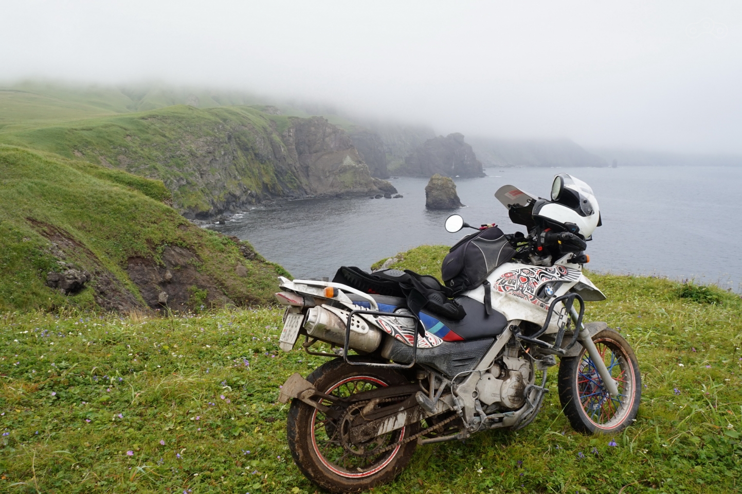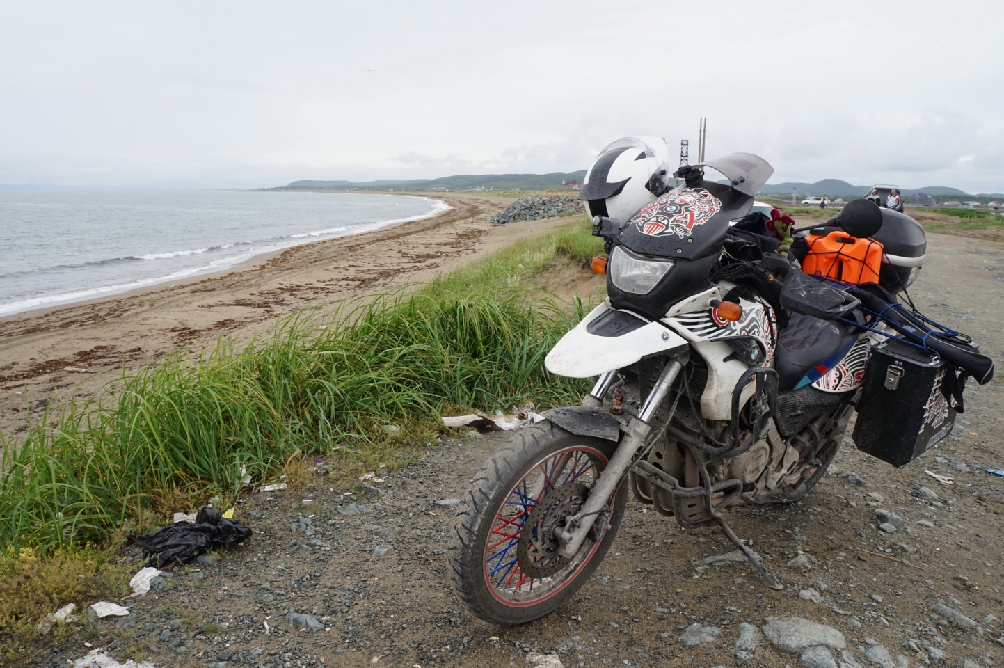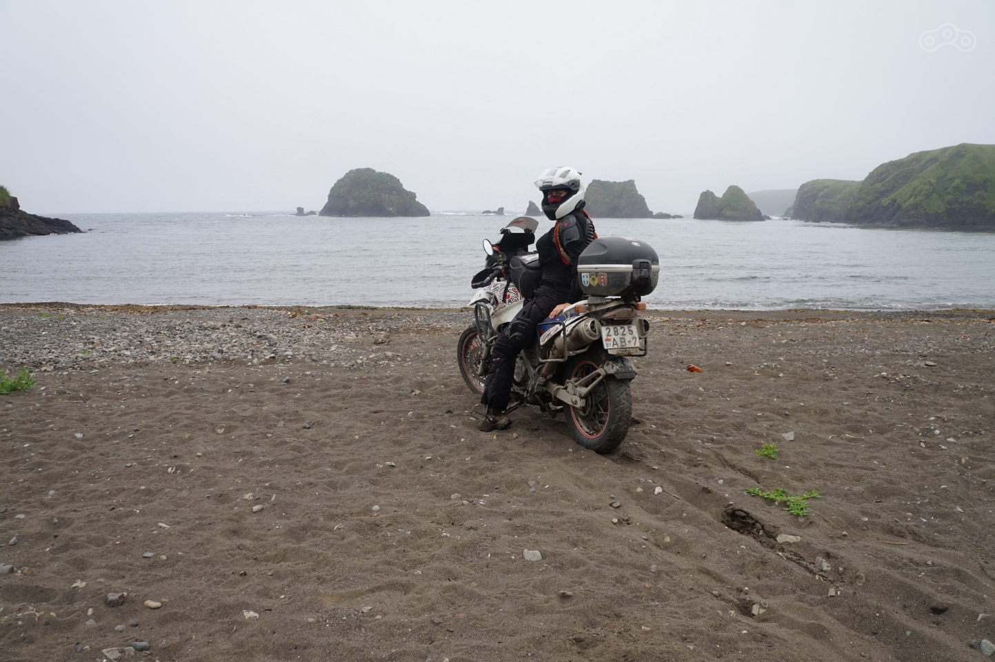 Их было еще несколько, но запомнилась та, которая текла по дороге. Или это люди проложили дорогу по реке. Один из самых сложных участков, мелкие скользкие камни и руль выбивает из рук, я вся мокрая под черепахой – то ли от ледяных брызг, то ли от работы мышц, а может и всё вместе. Выезжаем на берег Тихого океана. На адреналине я уже не боюсь даже песок и помогая ногами подползаю на мотоцикле ближе к воде. Здесь можно немного отдохнуть и я уже вижу его – Мой КРАЙ СВЕТА. Только отдыхать не хочется, ехать ехать, всё равно как, но вперед.