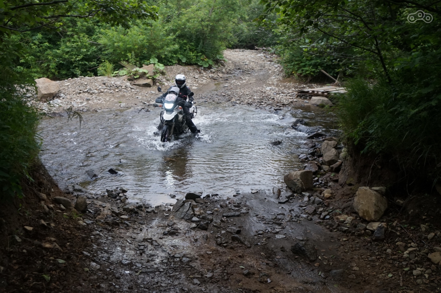Вот и первая речка. Вроде небольшая, но как ее проезжать-то. Женя уже машет – «Давай, вперед, газа больше и вот здесь, где поменьше камней». Была б девочкой-девочкой, наверное, зажмурилась бы, но нельзя. Влетаю в воду, вода попадает на двигатель, начинает дымиться, но я уже на другом берегу. Урааа!!! Едем дальше. Камни становятся всё больше, подъемы всё круче. Роняю мотоцикл на подъеме, наехав на большой валун. Женька помогает поднять. Двигаемся только вперед. Вторая речка побольше, но уже не так страшно. Проезжаю без особых проблем.