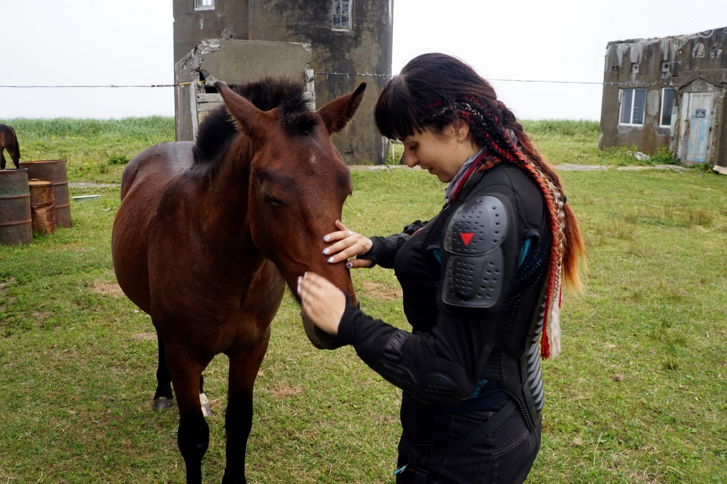 Женя не дает мне лентяйничать и тащит смотреть Мыс Непокорный, маяк Шпанберга. Мартын Шпанберг – российский мореплаватель, который и открыл остров Шикотан. Маяк построен японцами, вокруг много ржавых частей от каких-то морских агрегатов и вольно пасутся 2 лошади. Их всего 3 на острове – одна живет в Малокурильском и 2 – здесь.