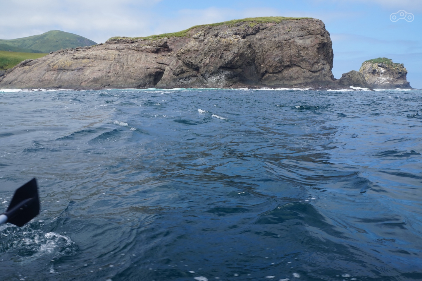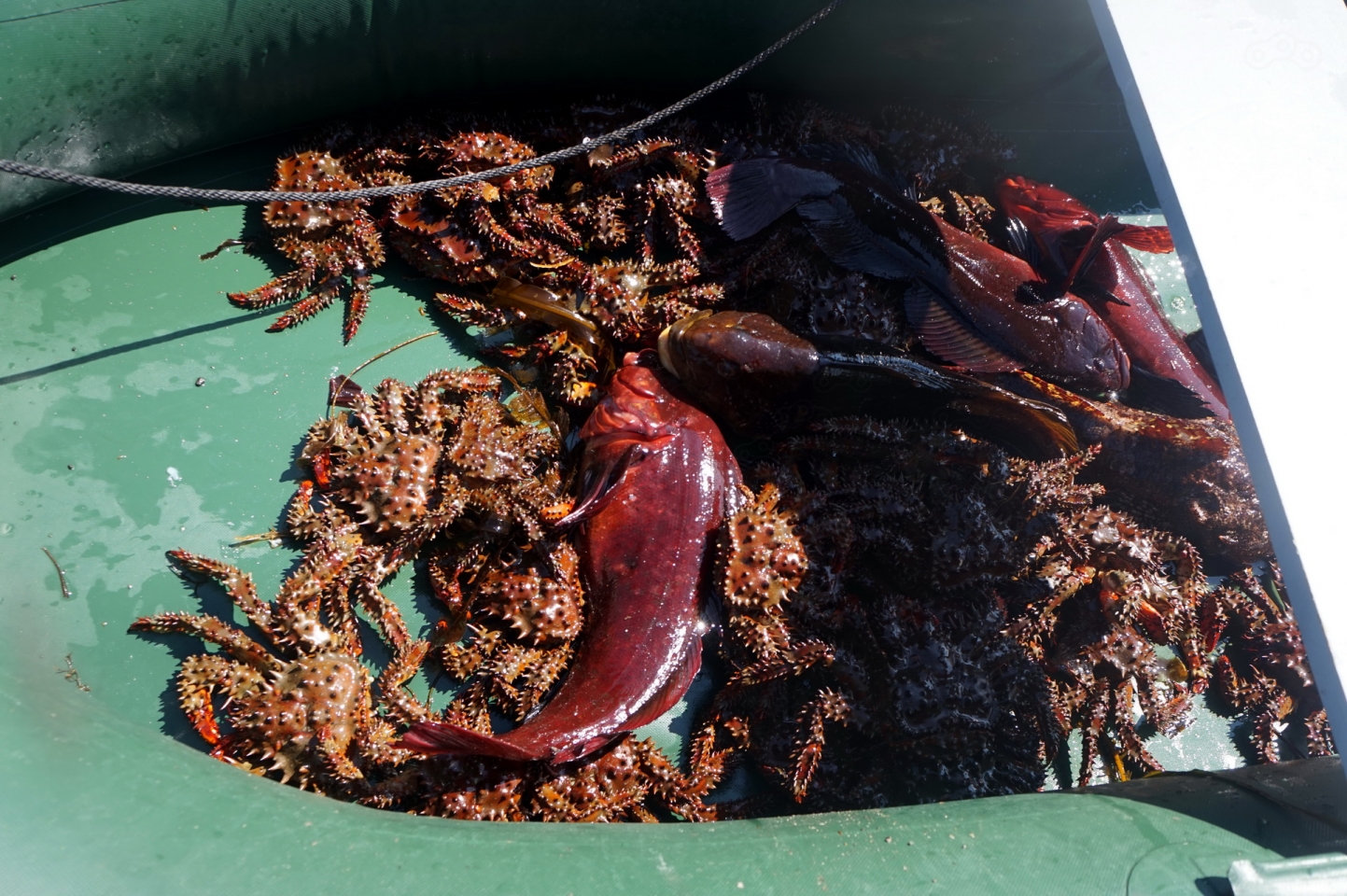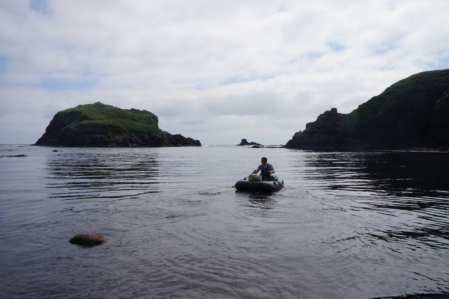 Обходим на веслах Край света со стороны Тихого океана, начинает сносить волнами, надо вернуться. Пока катались, в краболовку уже попали 2 первых краба, а в сетях уже 4 горбуши!