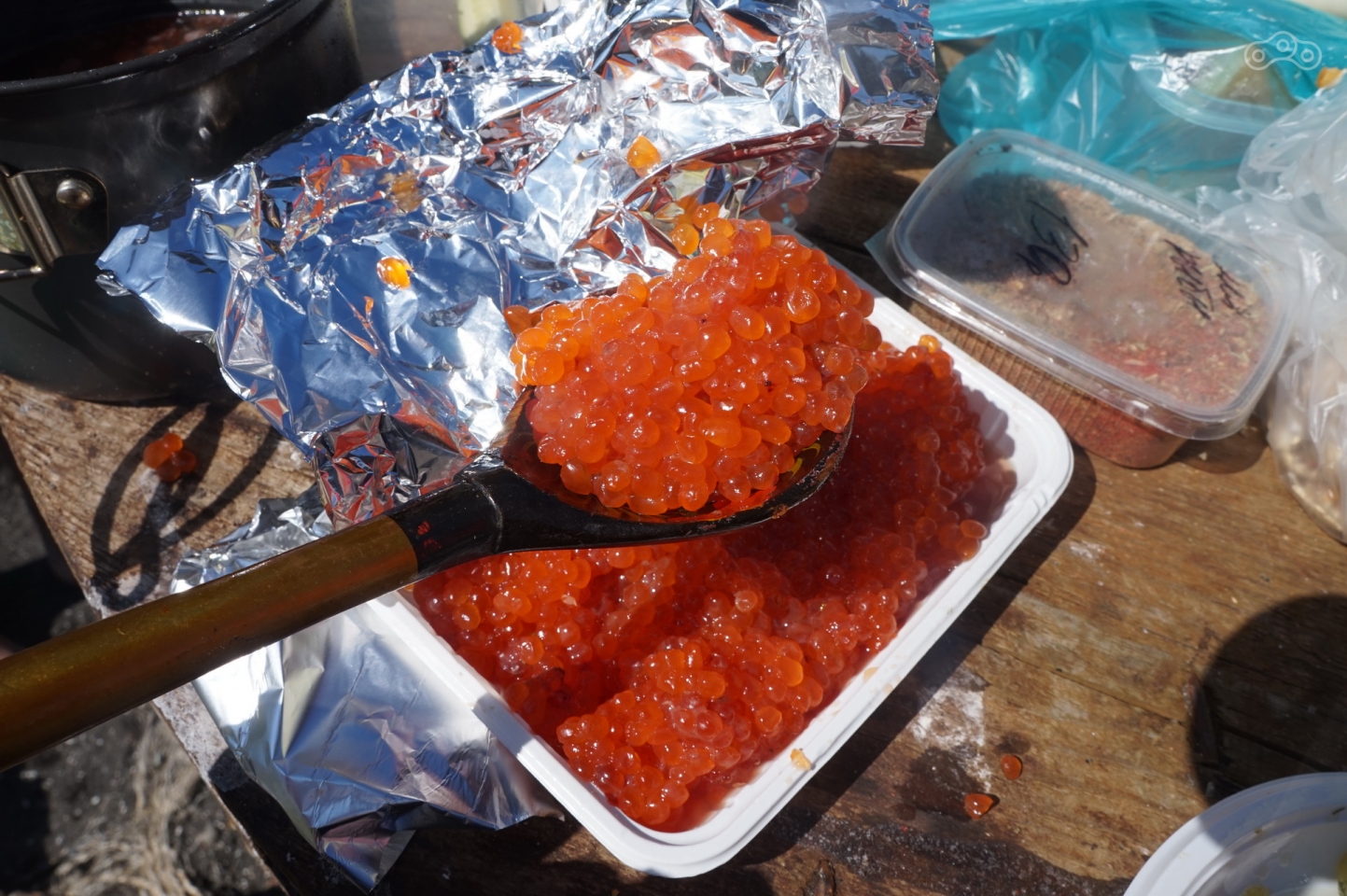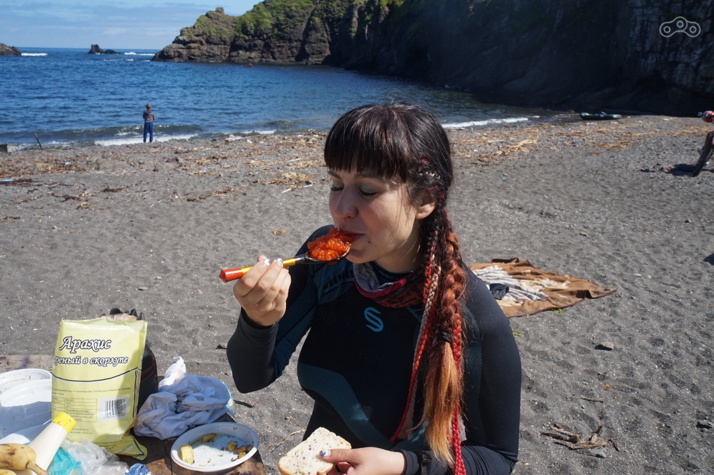 Ребята ловко вспарывают рыбам брюхо и у нас 3 девчонки с икрой! Вот это удача! Соленая морская вода кипятится на костре, затем туда высыпают икру и вуаля – готова знаменитая «Икра-пятиминутка». Вкуснее я в жизни не ела! Сочная, крупная, даже хлеб к ней не нужен.
