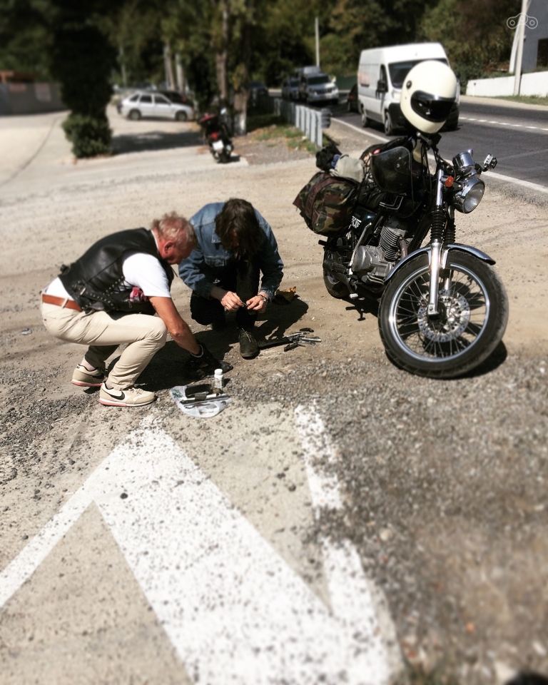 Ну а на серпантине, в жестком трафике, где приходилось объезжать жуткую пробку, то по обочине, то по встречке, задний тормоз просто отвалился))))) Нам крупно повезло, что почти тут же подъехал дядечка, настоящий байкер, но почему-то на мопеде…Перебрав все инструменты, что у него были, мы нашли иголку для шприца, которая спасла меня, вылетела какая то шпилька которая держала лапке тормоза, в итоге, я все путешествие так и проездила с этой иголкой))))