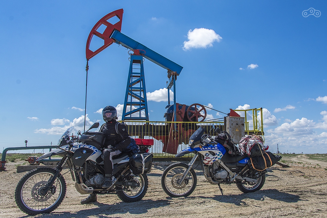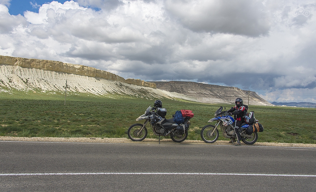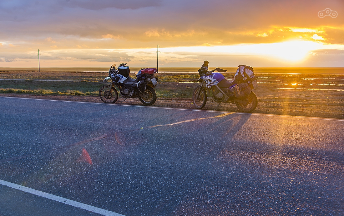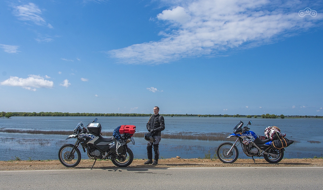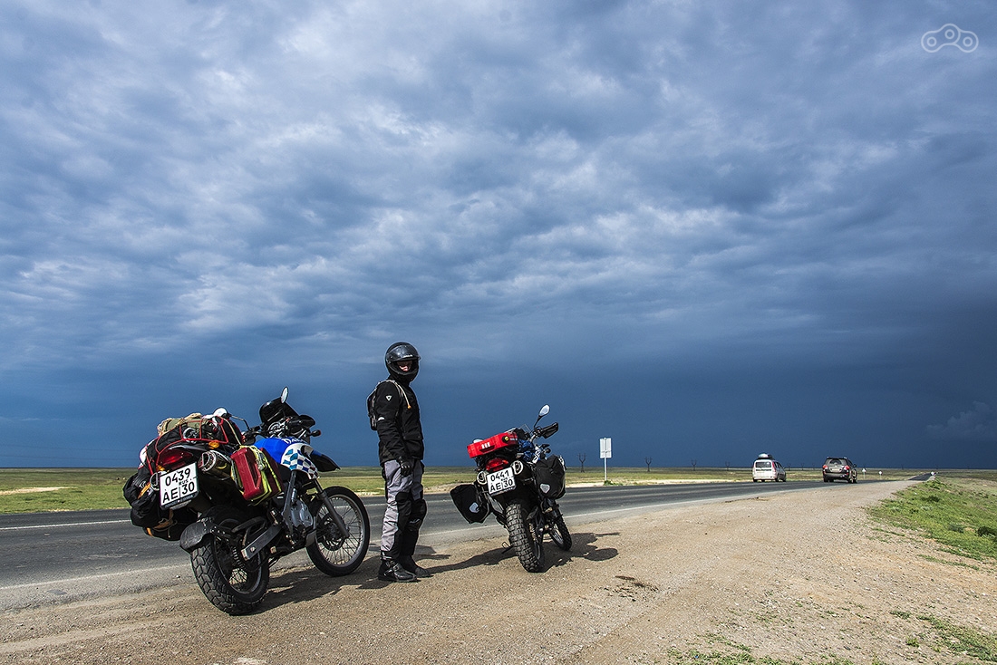 Участок дорооги от Астрахани до Атырау разбитый, но ехать на мотоцикле вполне комфортно — ямы легко объезжаются. Байки пока еще чистые, но впереди тучи...