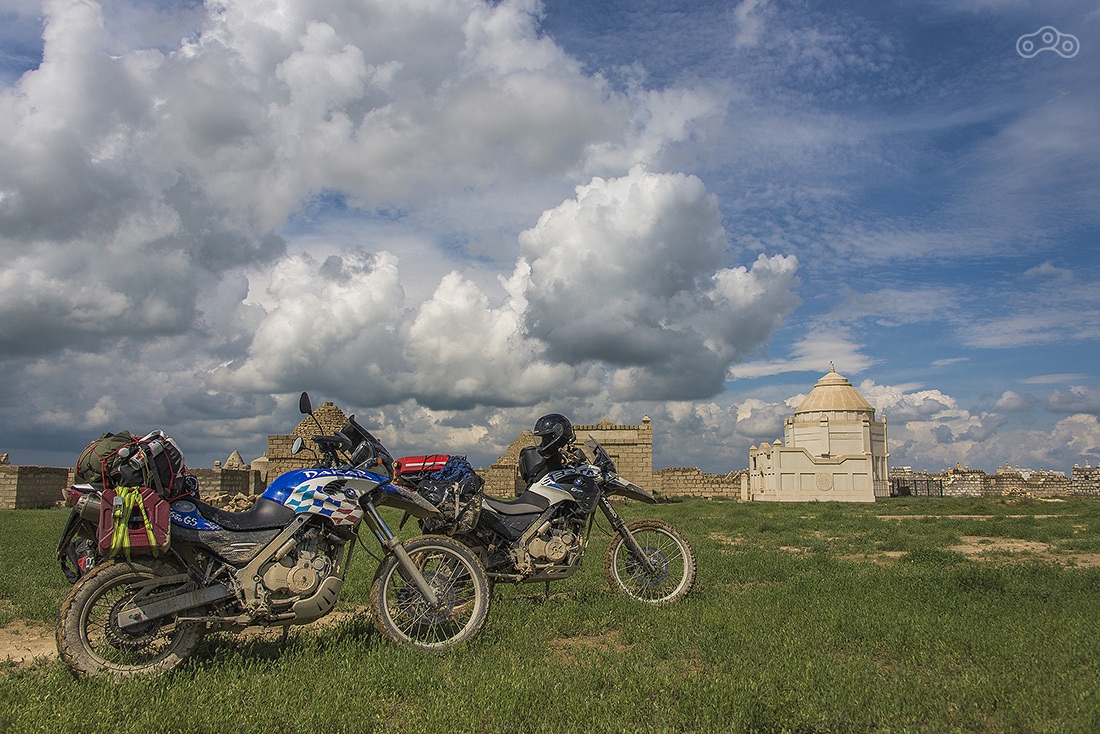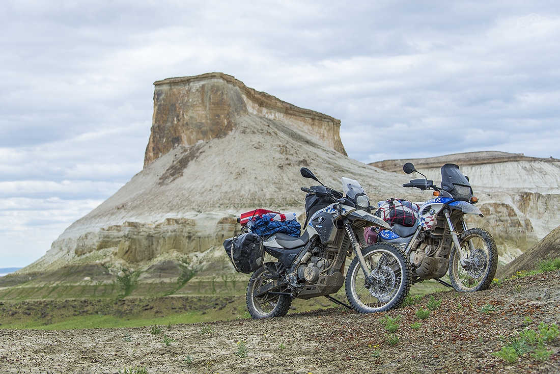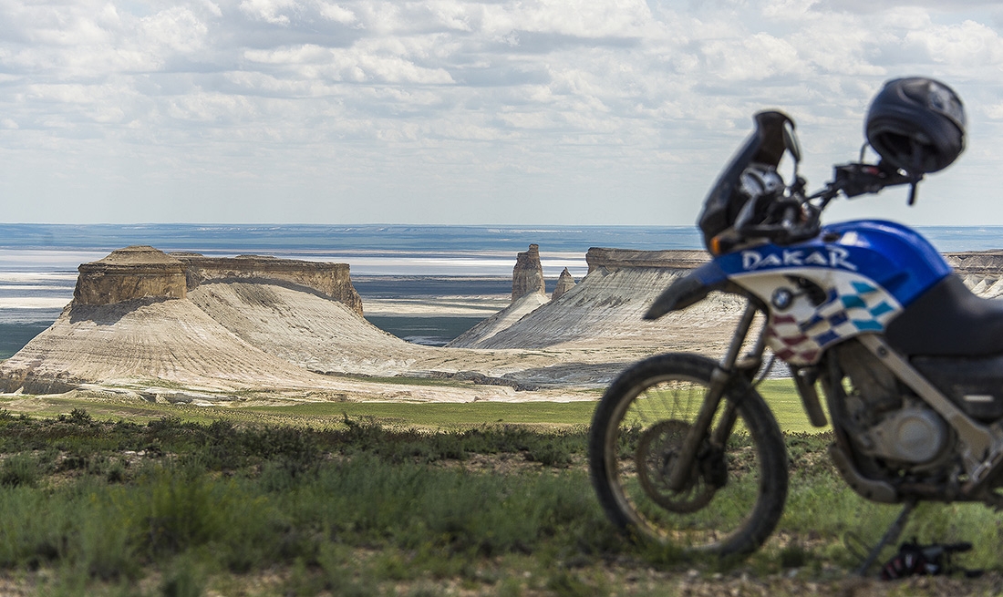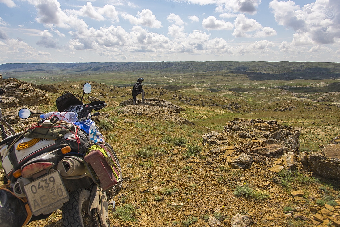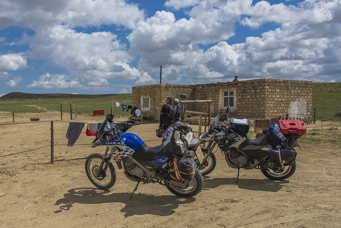 Участок дорооги от Астрахани до Атырау разбитый, но ехать на мотоцикле вполне комфортно — ямы легко объезжаются. Байки пока еще чистые, но впереди тучи...