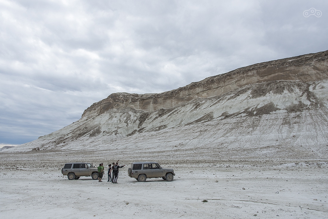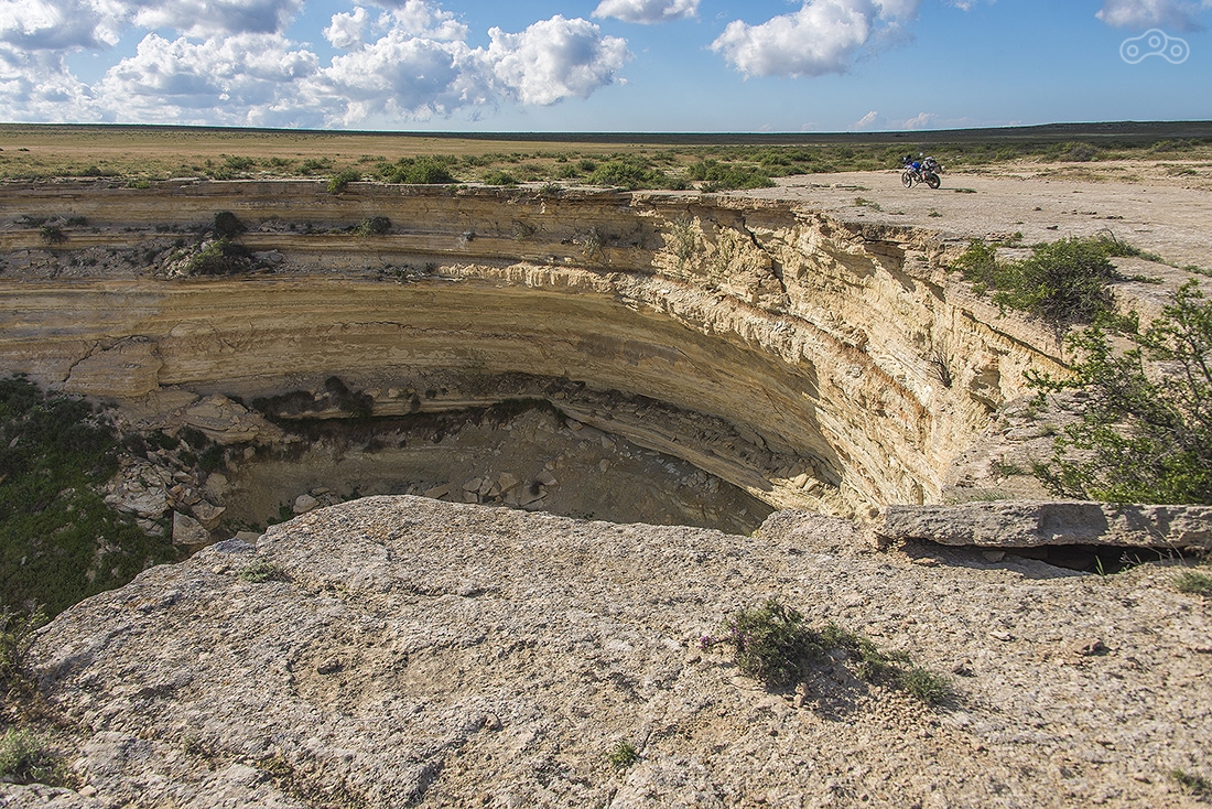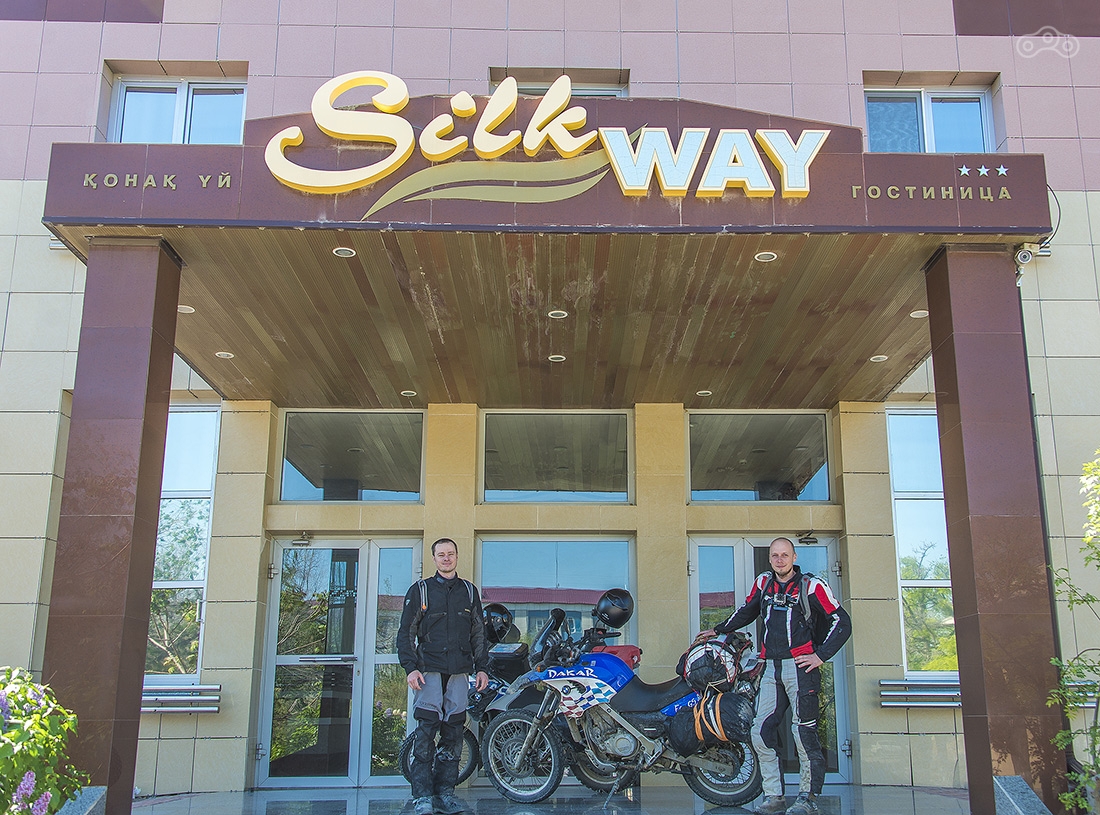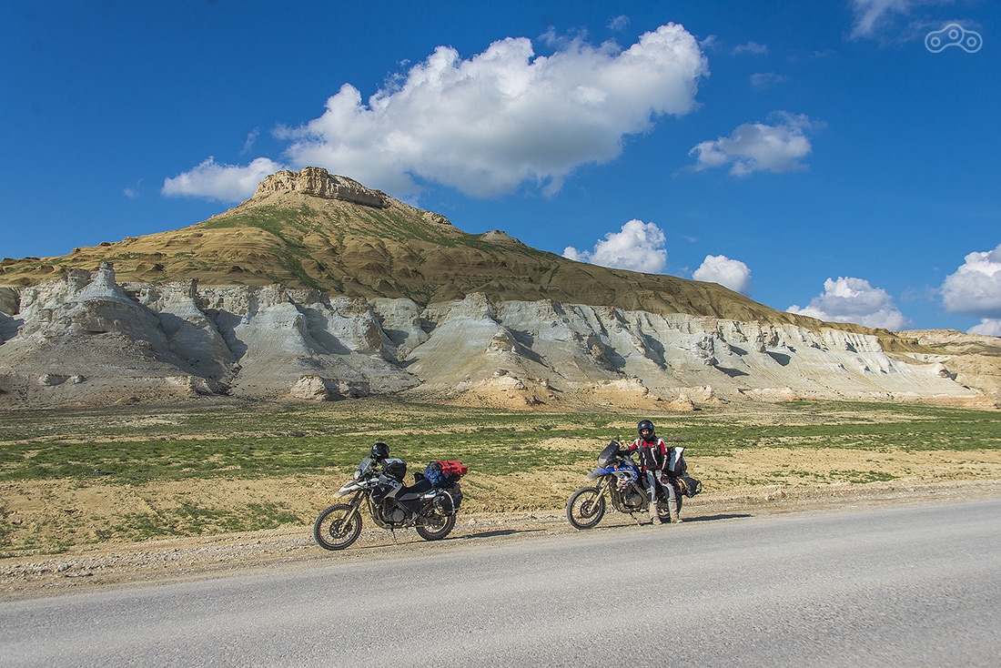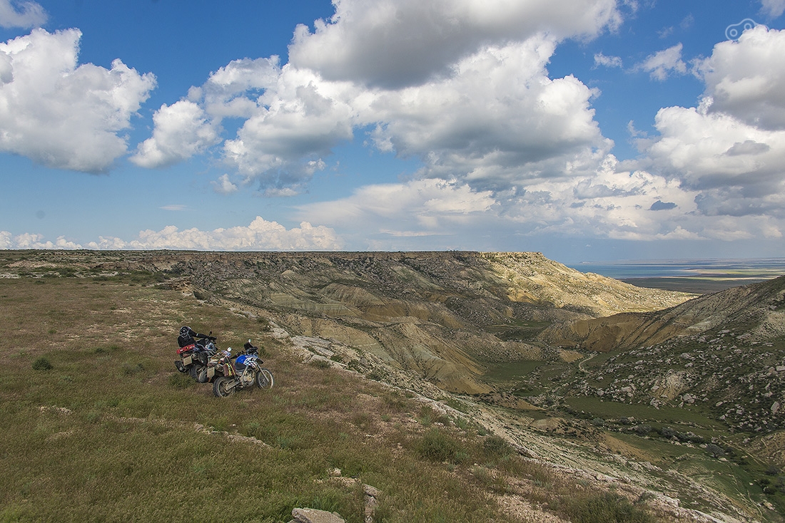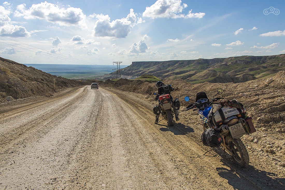 По дождям и грязи доехали до Кульсаров, переночевали в неплохом отеле (название уже не вспомню), утром выдвинулись в направлении Бейнеу. Там живет тот самый дядя Лёша, который может помочь с ремонтом мотоцикла, ночлегом и питанием. У него что-то вроде гостиницы для мотоциклистов. Но заезжать к нему мы не стали, поехали дальше. Буквально через несколько километров после Бейнеу дорога пошла вниз и мы поняли зачем мы все это затеяли...