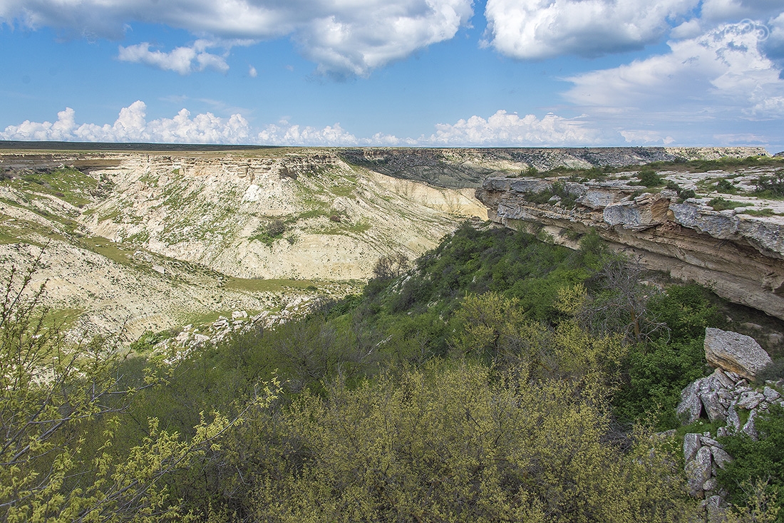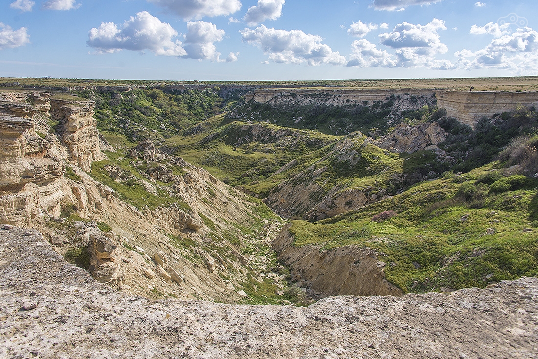 Все это время вокруг была только степь — ровная и бесконечная, но оказалось, что все это плато, высота которого постепенно росла. Здесь та точка, где вид резко изменился. Пять минут назад была степь, а тут бац — и сразу горы. Это очень старые меловые горы, которые легко осыпаются, поэтому здесь никакого скалолазания быть не может. Еще там можно найти окаменелости древних морских животных, которые тут жили, когда все это было под водой.