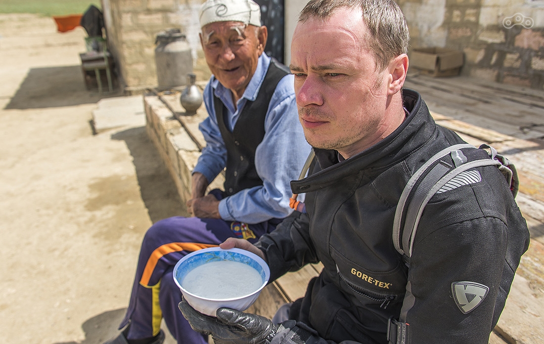 За все время нам встретился только один человек — водитель застрявшего трактора (да да, чем круче джип, тем дальше... а если трактор, то совсем далеко). Он посоветовал заехать в единственный на этом участке аул, там возможно есть 80ый бензин. Нас встретил очень веселый молодой казах, который ни слова не понимал по-русски и постоянно улыбался, предлагал водку. Хозяина на этой ферме не оказалось, нашли его в степи, он дал нам 10 литров бензина просто так, денег не взял совсем. Еще и шубата в дорогу налил. Без его бензина мы бы встали задолго до трассы. Не расчитывали, что попадем в такое болото.