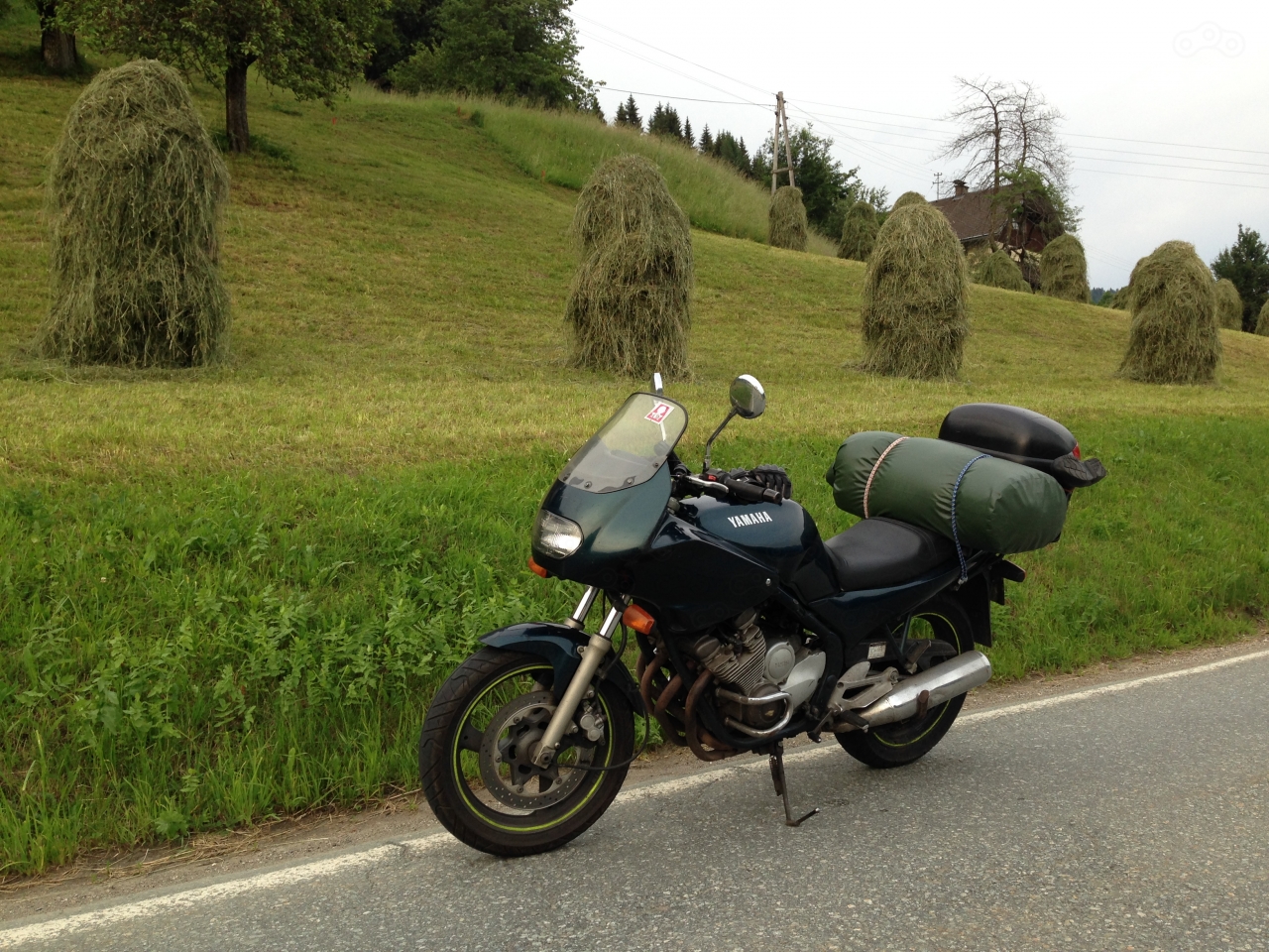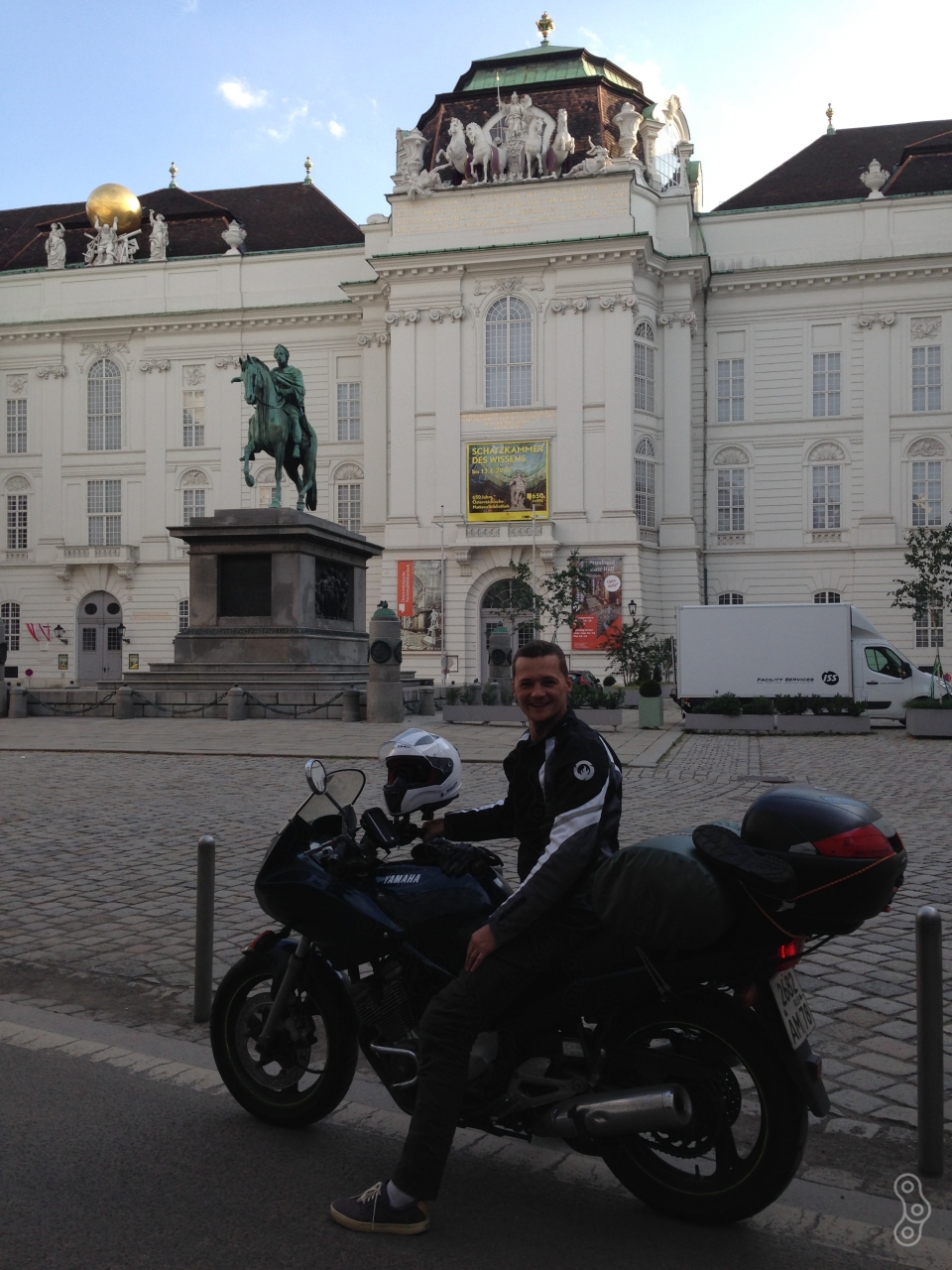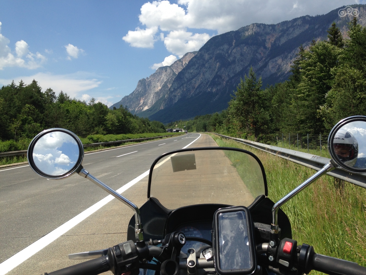 А в Чехии меня конкретно залило дождём, сильно и долго! Тонкая куртка не спасла, а дождевик я не успел купить. Зато в Австрии сразу стало теплее и я сушился встречным потоком. Но в сапогах вода так и стояла по край, пришлось переобуться в кеды и сапоги привязать сзади, с них ещё долго капало, как из крана. Так и въехал в столицу Австрии...