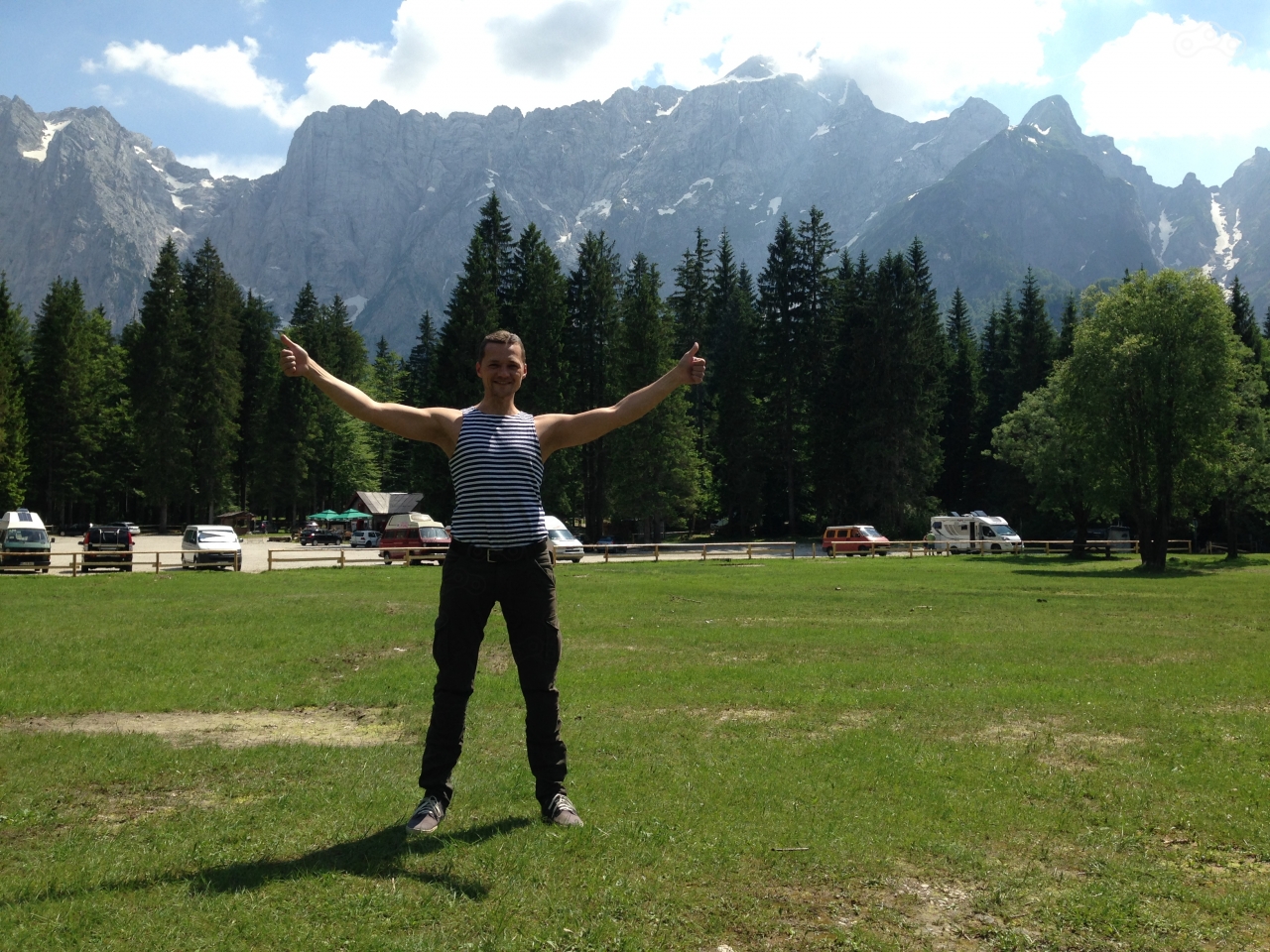 Вечером уже в Австрии свернул в лес на ночёвку. Спешился, ищу место для палатки. Сбоку от дорожки подходящая круглая полянка, но на ней посередине какая-то хрень. Подхожу и вижу кормушку с разным кормом для оленей! Поднимаю голову, а на дереве видеокамера, засняла таки русского оленя!)