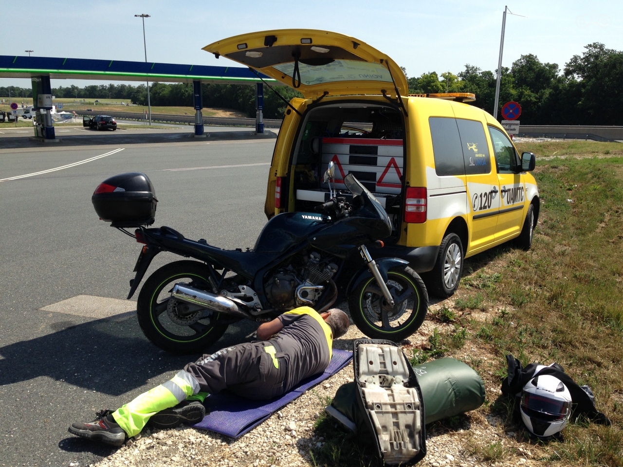 А на утро старушка просто не завелась. Я вытолкался из леса на дорогу, голосую. Все крутые ГуСи пролетают мимо, солнце уже припекает голову, настроение на 0. Подъезжают полицейские, где жилет, и вообще тут стоять нельзя, это автострада! Я им руками показываю - дёрните меня верёвкой и я уеду и проблем на вашем участке не будет! Делать нечего, соглашаются! Новый Пассат Б8 в боевой раскраске и с включенной люстрой тянет меня домой! Круто но не весело, не заводится... Завернули на заправку, отцепили. Говорю им, нужен механик, и я уеду и проблем на вашем участке не будет. После обзвона сообщают мне, что сегодня воскресенье и никто не работает, только срочный вызов за 139 евро. Делать нечего, соглашаюсь.