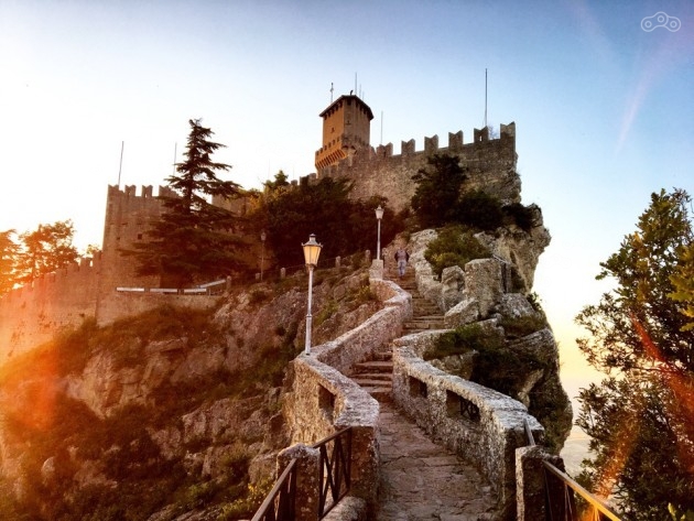Мы долго бродили по крепости, фотографировались, встречали закат, слушали птиц — уходить не хотелось. Мы даже поспорили — нашивать ли флаг на жилетку, ведь это карликовая страна: по факту, мы до нее доехали, но она окружена другой страной, поэтому казалось, что мы просто съездили в соседний итальянский город. Но это настолько красивое место, что со временем дилемма разрешилась сама собой, и теперь на спине красуется бело-голубой флаг Сан-Марино как знак уважения к детским мечтам.