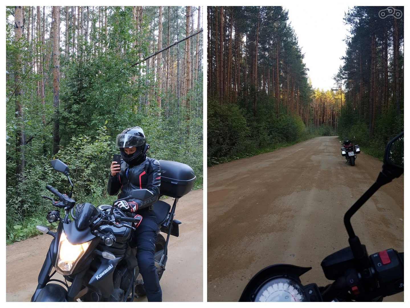 До Глобуса на Ярославском шоссе я добрался к 6 часам. Заправились, решили застыковать наши гарнитуры... Не тут-то было. Packtakl Bolt и SkalaRider никак не могли найти общий язык... "Ну не беда, победим их завтра", - подумал я. Вот теперь можно сказать, что путешествие началось. Что ни говори, вдвоём ехать веселее. Гостиница была забронирована в Калязине на берегу р. Жабня. Маршрут должен был проходить 100% по асфальту, но наш навигатор посчитал, что это будет слишком просто. Поэтому сначала мы заехали в лес по грунтовке, а потом еще 5 км по грейдеру, тем самым разнообразили наш короткий прострел до Калязина.