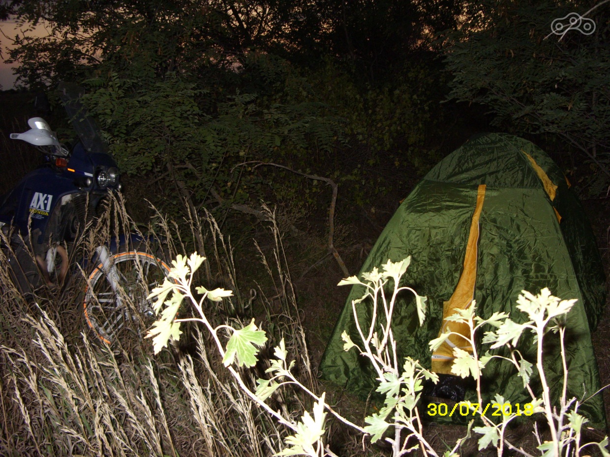 Первый день просто старался быстрее проехать знакомые места и настроится на путешествие. Когда стартуешь в первый раз на большое расстояние то в голову лезут всякие мысли «а доедет ли мот…», «а что делать если он сломается…», «а зачем мне это вообще нужно…», «а где я буду ночевать…» и все такое. За первый день удалось проехать 780 км и преодолеть расстояние от Челябинска до Самары. Как только стало темнеть начал присматривать место для ночевки и заехал в первый понравившийся лесок невдалеке от Самары. Поставил палатку вскипятил воды на горелке, поужинал и попробовал уснуть, что оказалось не так уж и просто, в лесу ночью весьма-таки шумно птицы различные и самое неприятно, когда понимаешь, что что-то крупное ходит неподалёку от палатки и слышен хруст веток под ламами. Наушники в уши включил музыку и сразу нормально уснул, когда музыка заглушила все посторонние звуки.