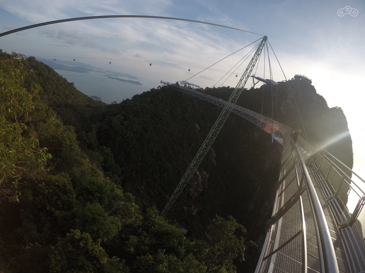 Последней точкой, которую мы хотели посетить на этом острове, был знаменитый Небесный Мост (Langkawi Sky Bridge.) — высочайшее достижение инженеров Малайзии. Уникальность его в том, что он является самым высоким одноопорным во всем мире. Мост действительно опирается на единственную металлическую опору. Всю мощь сооружения крепко и надежно распределяют между собой 8 тросов, прикрепленных все к той же единственной опоре. Создается впечатление, что он буквально парит над пропастью, а в очень ветреные дни еще и немного колыхается.
