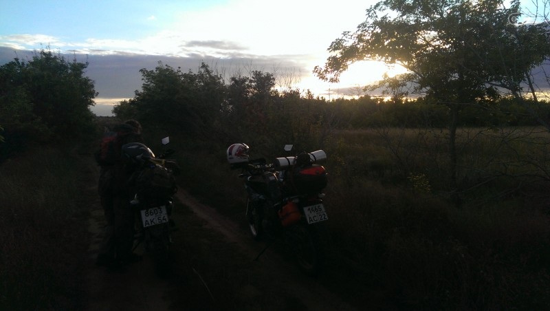 И вот, в районе часов восьми, мы мчимся по трассе. Надо отметить, что Лёхин мотоцикл был совсем новый и еще на обкатке. Я думал, что поедем мы не быстрее 80 км/ч (чтоб не напрягать сильно движок), но проехав около двадцати километров, Лёха жарил уже около 100-110. Мы ехали на встречу закату, периодически останавливаясь на перекуры и сверяясь с навигатором. До первой предполагаемой стоянки нужно было преодолеть около 200 км. На очередном перекуре, глядя как солнце неумолимо скрывается за горизонтом, я предложил не ехать дальше, а здесь съехать с трассы, найти полянку и заночевать. Ехать до места оставалось около 50 км, а темнело прям на глазах. Ставить палатку, искать дрова и готовить еду в темноте, то еще удовольствие, поэтому было принято волевое решение дальше не ехать.