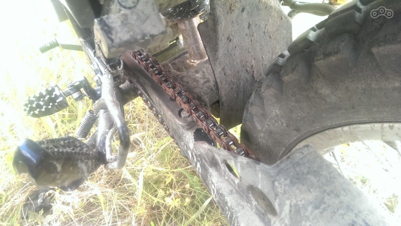 На очередной стоянке решил глянуть на цепь, а она покрылась красной пылью и натянулась как струна. Что за… Она ведь должна растягиваться, а не натягиваться. Начали разбираться. Оказывается, за 1000 км. пробега, новая цепь, купленная на Новосибирском заводе цепей, сгорела! Да так, что заклинило в наклонном положении почти все звенья, а некоторые ролики просто отсутствовали.