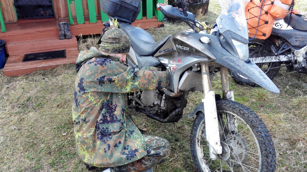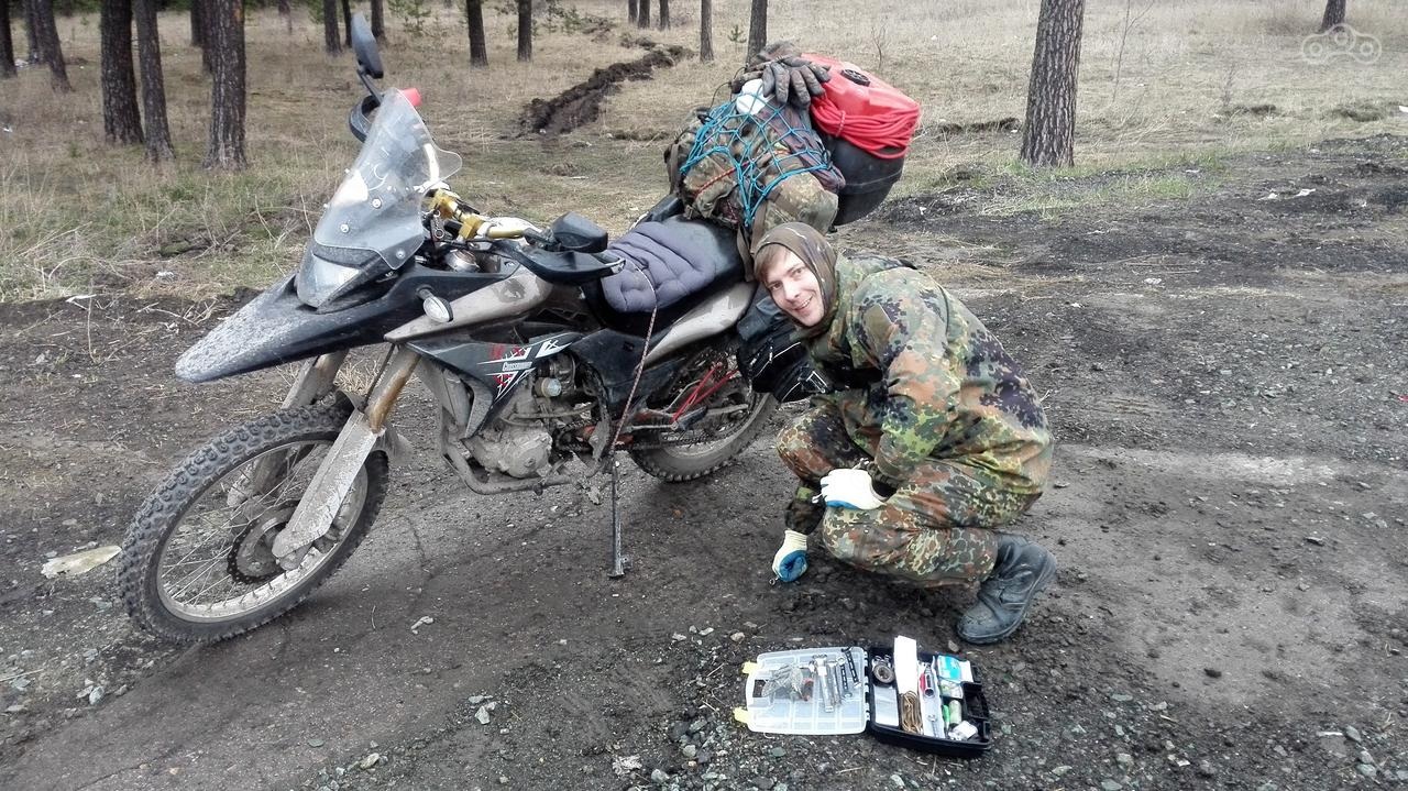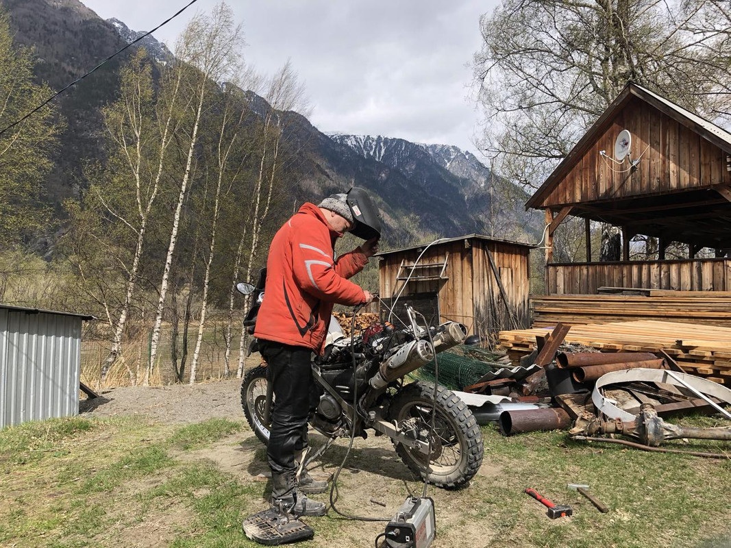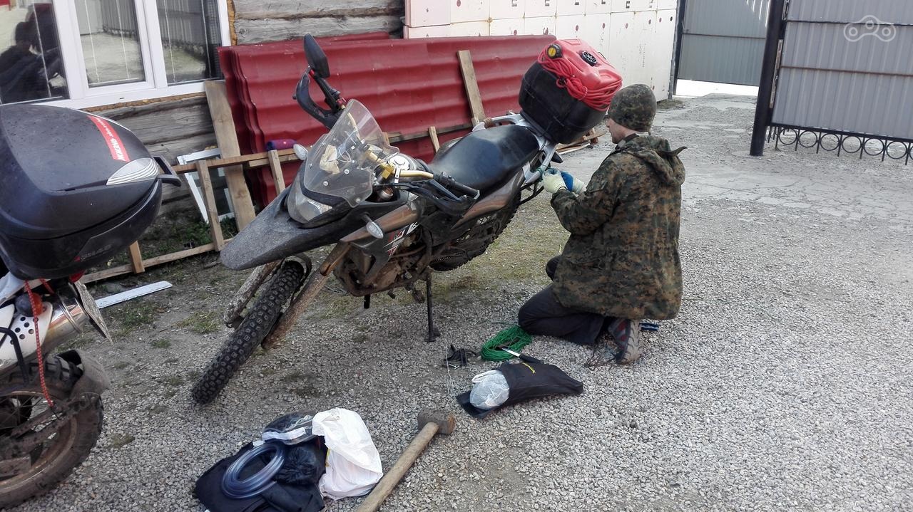 Утро четвёртого дня мы начали с ремонта. Мне предстояло выяснить течёт ли у меня бензобак, почему перестала работать USB зарядка и что-то сделать с подножкой, а то чего доброго еще раз завалиться на небольшом наклончике. А перед Лёхой стояли следующие задачи: приклеить отвалившееся зеркало, протянуть спицы на заднем колесе, придумать как закрепить отломившуюся багажную рамку и поменять масло. В общем скучать нам не пришлось.