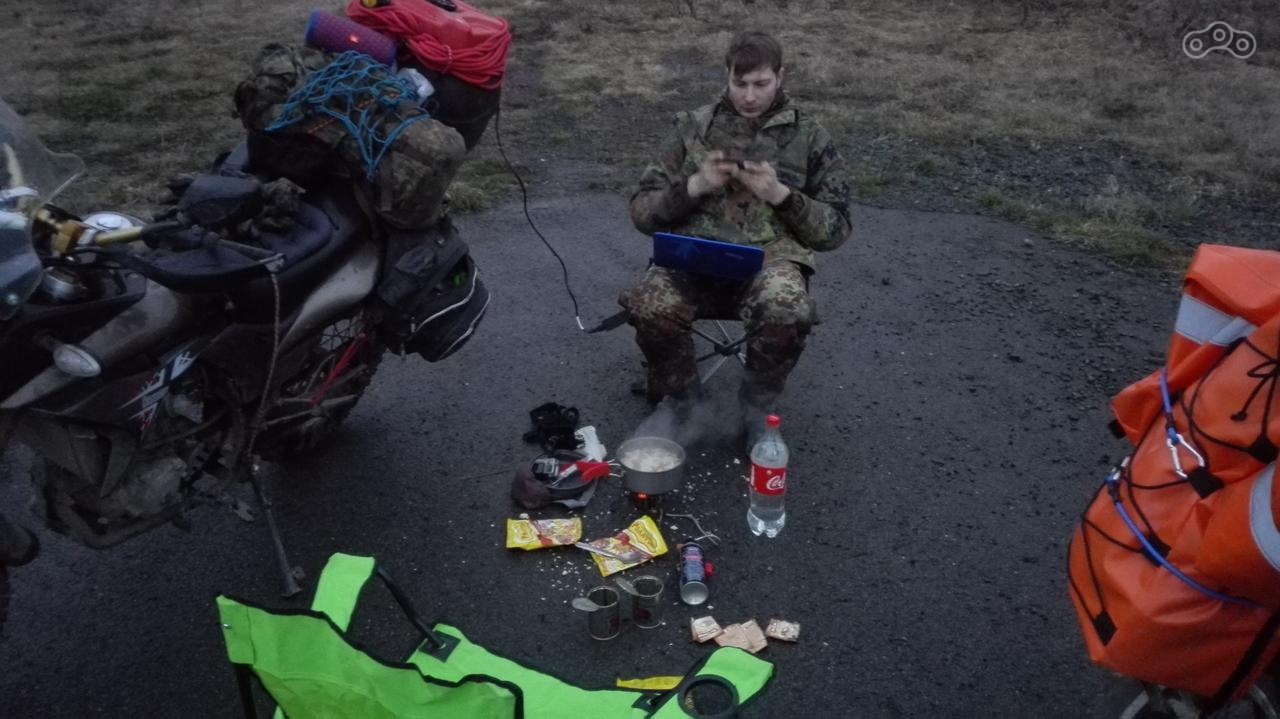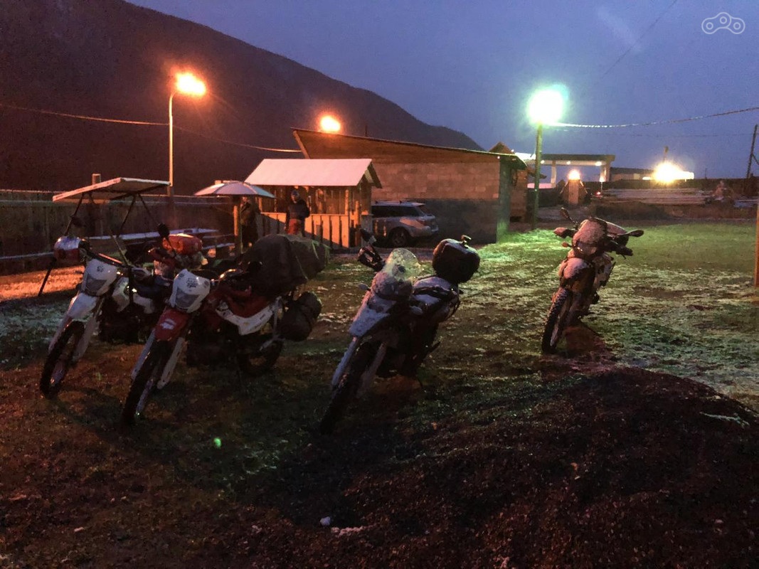 И вот уже показались огоньки села. Ура, добрались. Останавливаемся на первой же попавшейся турбазе и просим затопить баню. Кое как сняли вещи с мотоциклов, скинули с себя всё мокрое и пошли на террасу готовить ужин. Почти все банки в моей сумке после падений на бок, превратились в произведение абстракциониста.